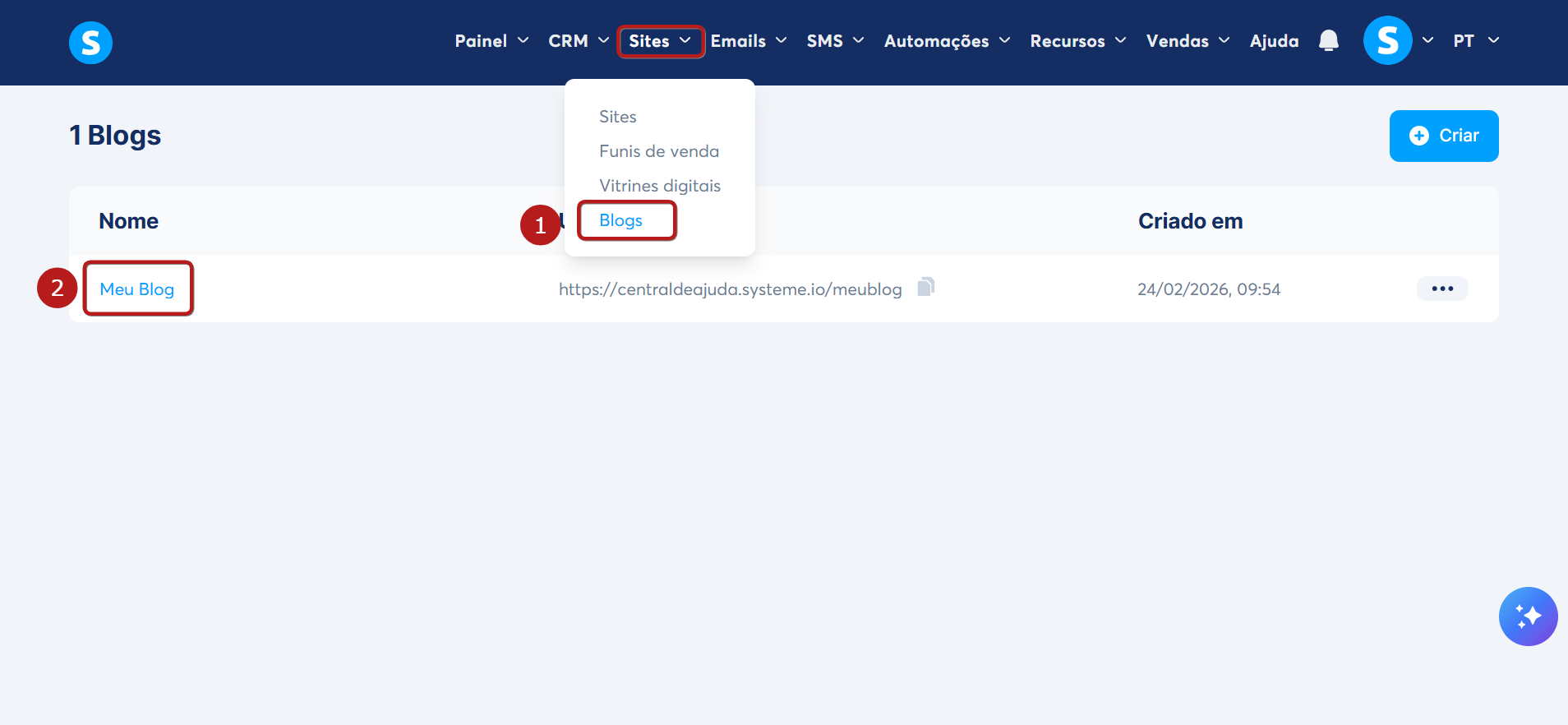 No menu, acesse a aba Sites, selecione Blogs (1) e clique no título do seu blog (2).