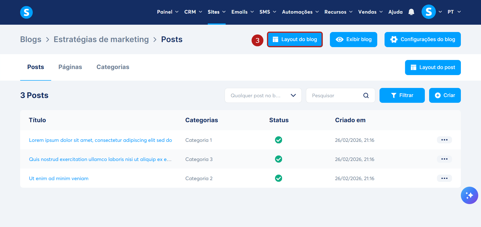 Na interface de configurações do seu blog, clique no botão Layout do blog (3).