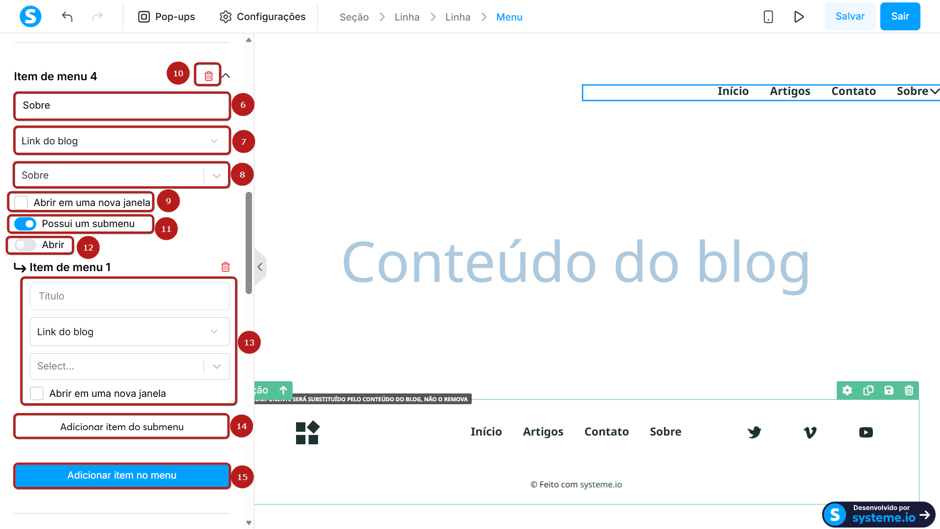 • Adicionar item no menu (15): clique neste botão para criar um novo item no menu principal.