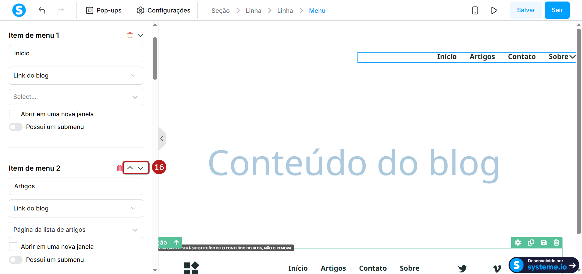 • Mover item do menu (16): Use as setas para reordenar os itens do menu.