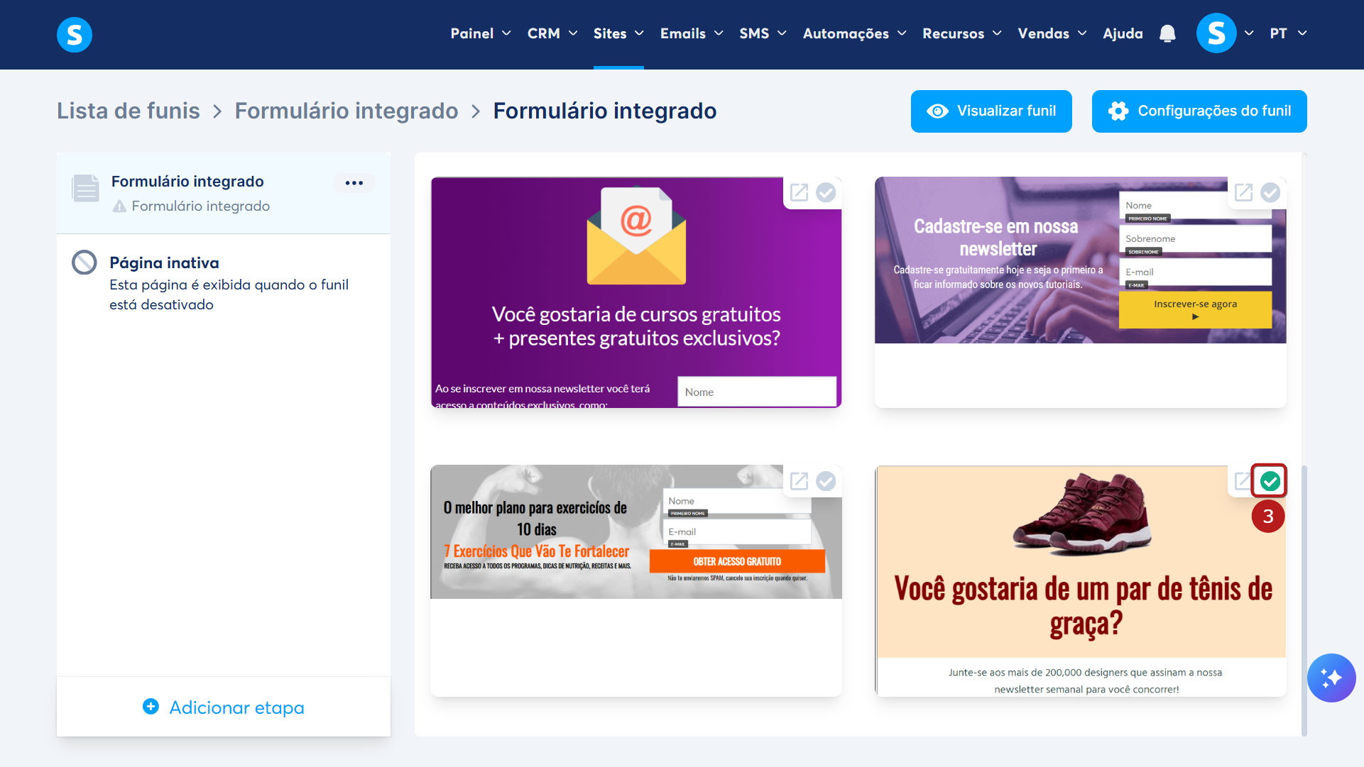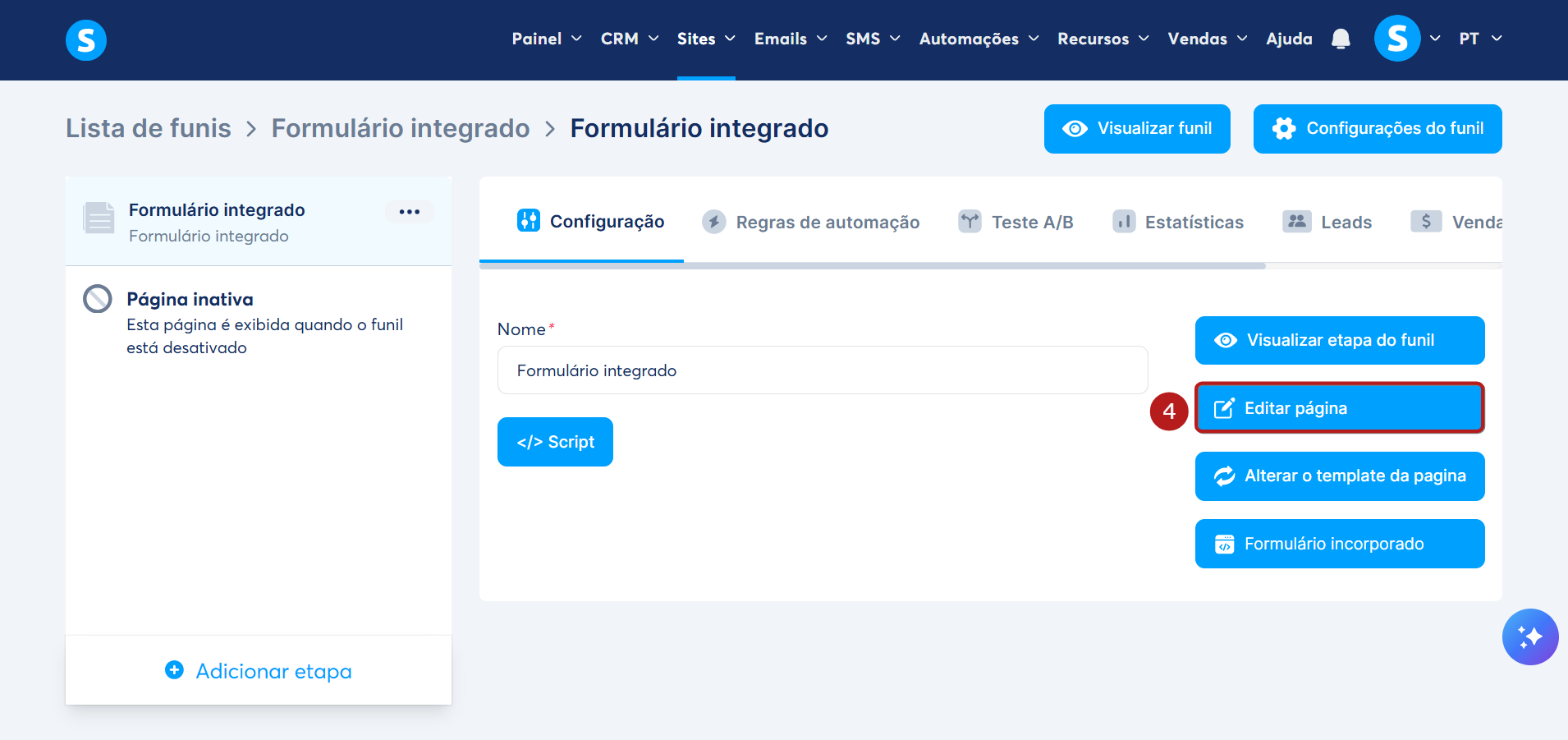 Para fazer isso, vá até o seu Funil de Vendas, clique em Adicionar etapa (1) e selecione Formulário integrado (2).