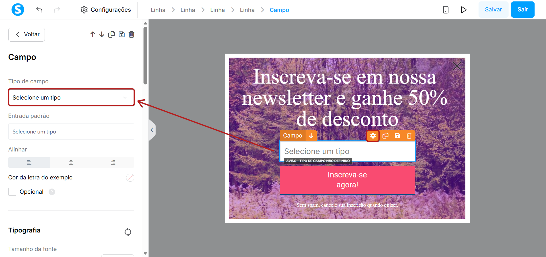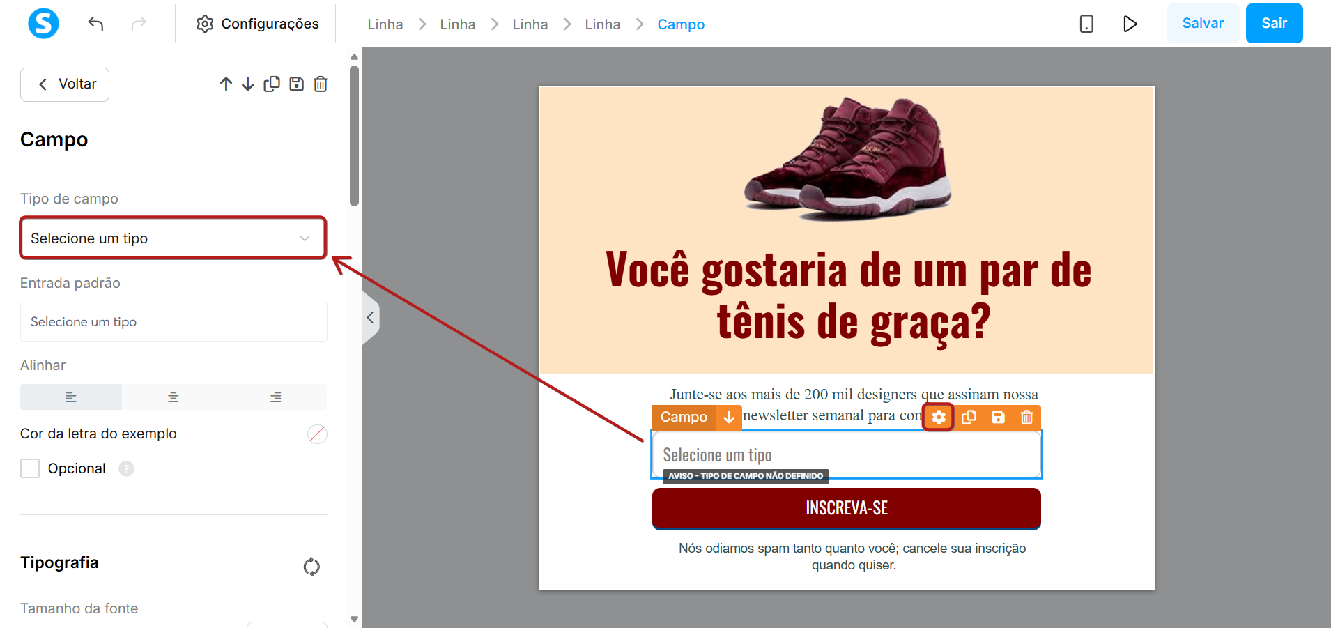Selecione o elemento Campo de formulário e clique no ícone de configurações; no menu suspenso, selecione o Tipo de campo que você deseja coletar.