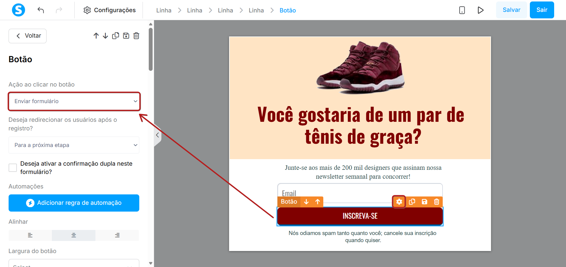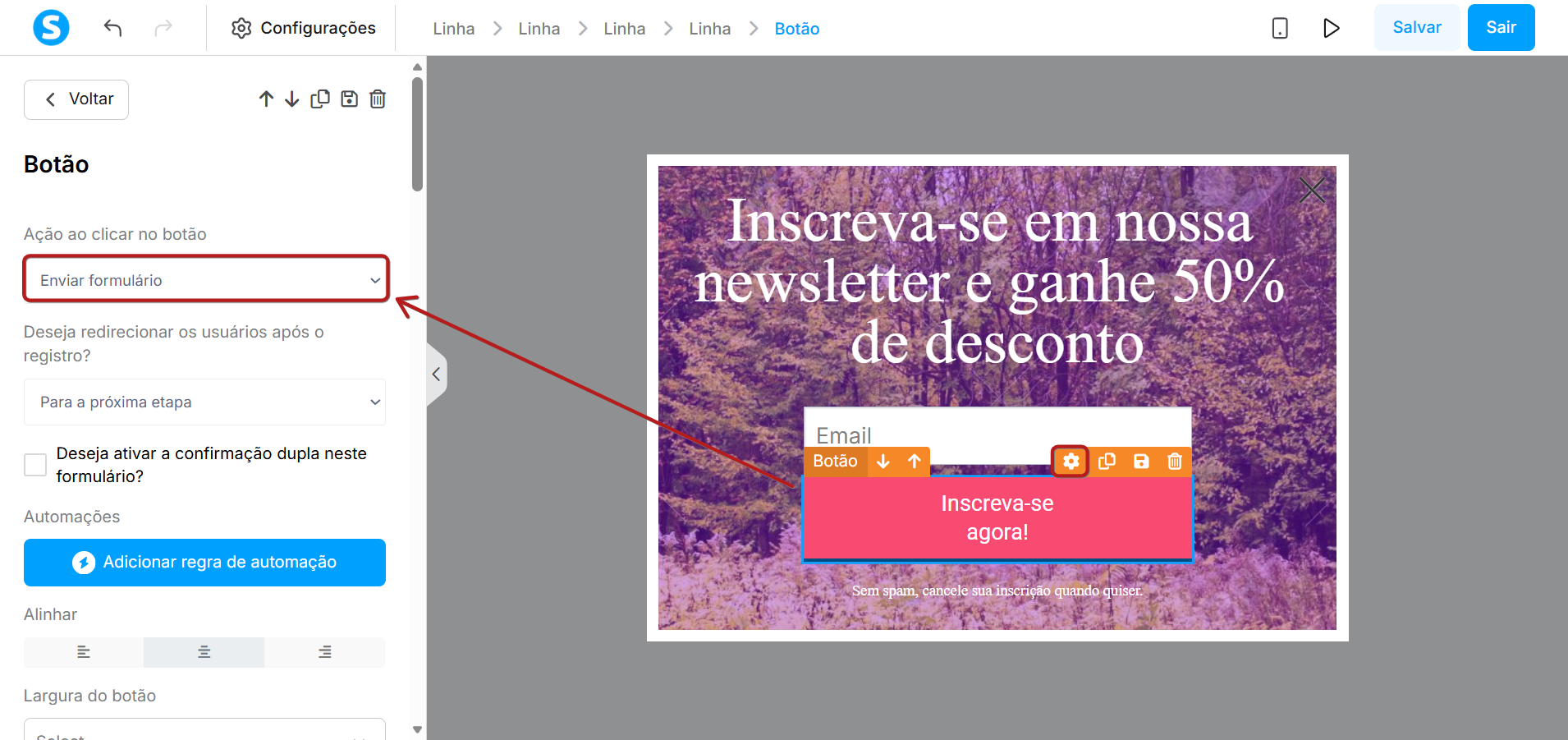 Também é necessário configurar a ação do botão. Selecione a opção Enviar formulário e defina para onde redirecionar os visitantes após o envio.
