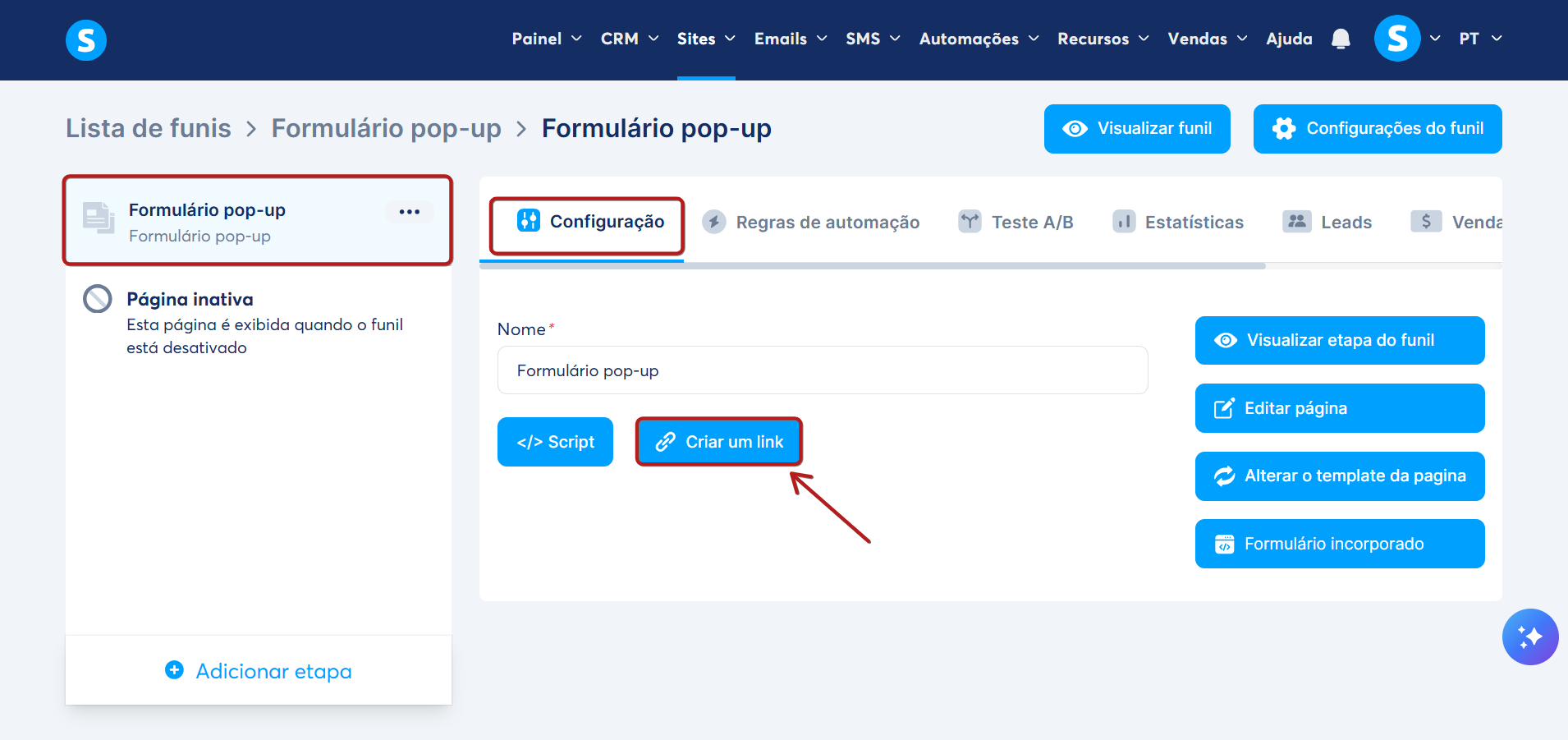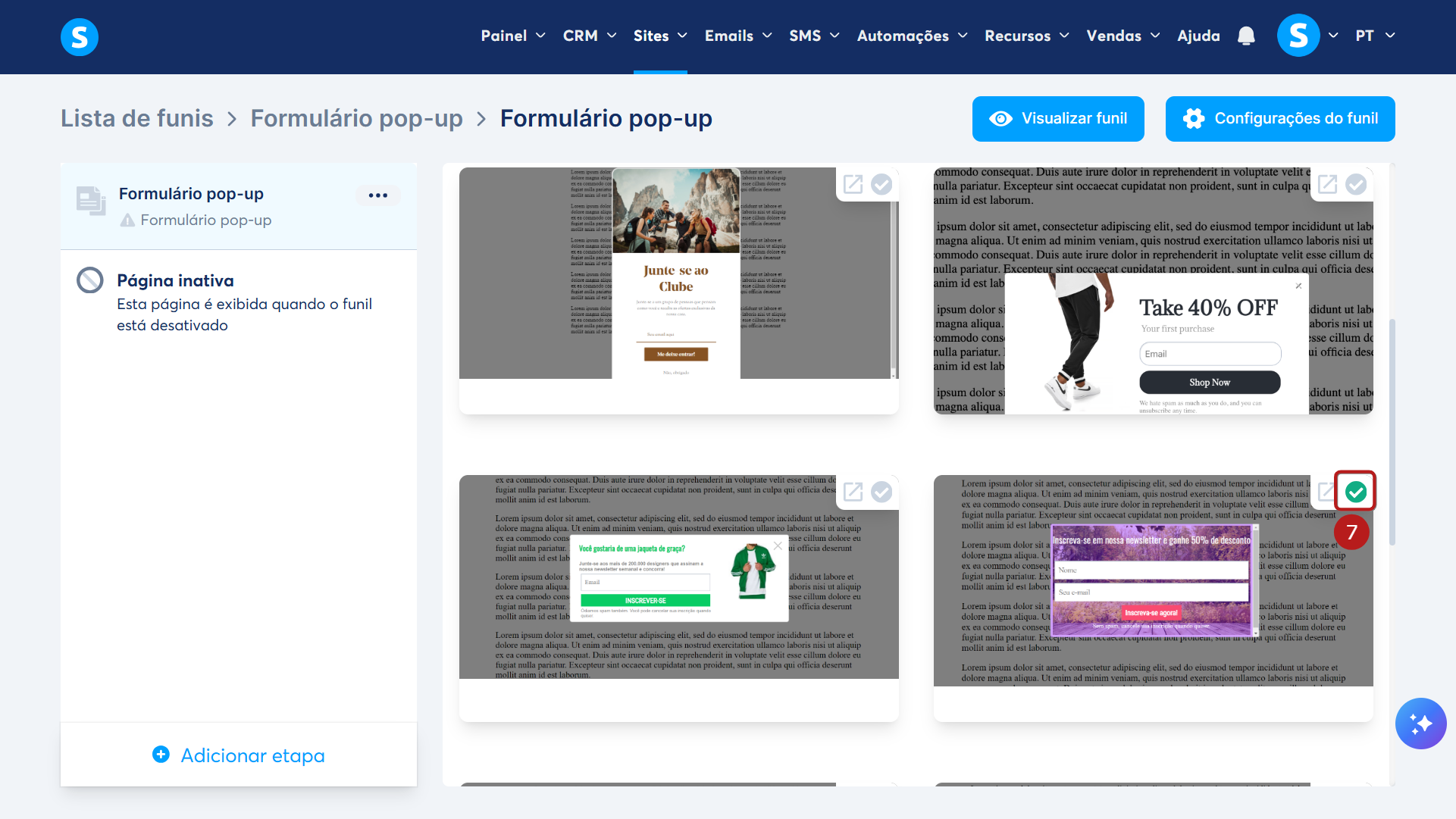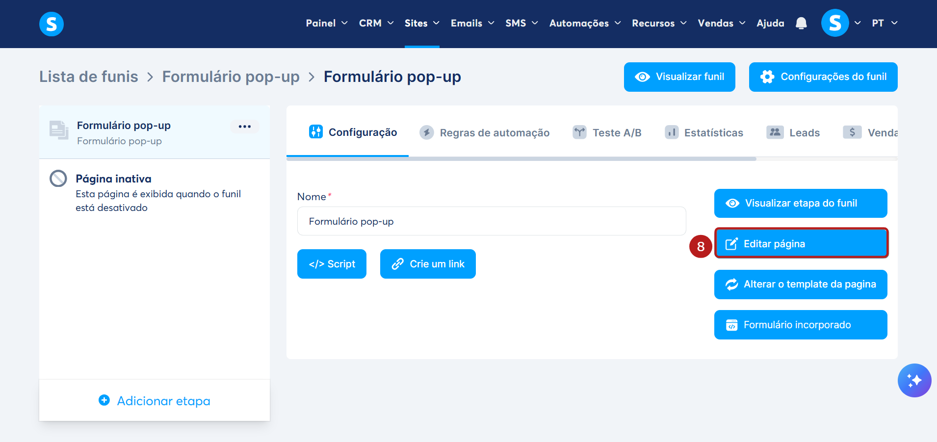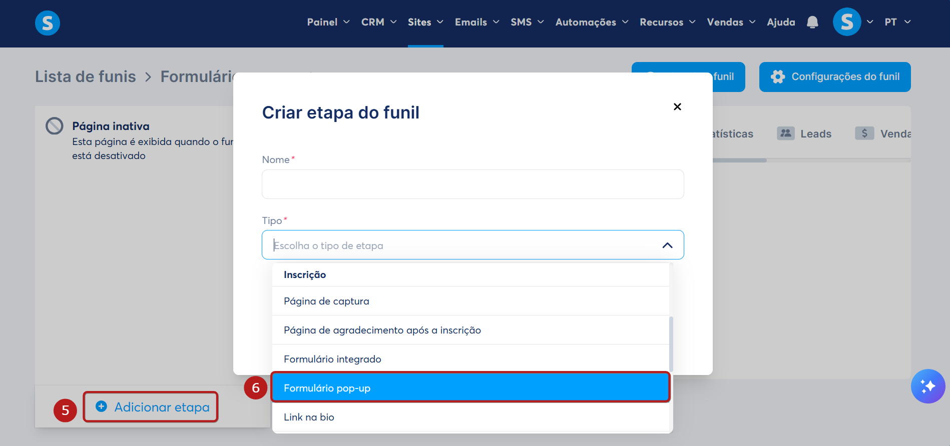 Vá até seu Funil de Vendas, clique em Adicionar etapa (5) para criar uma nova etapa e selecione Formulário Pop-up (6).