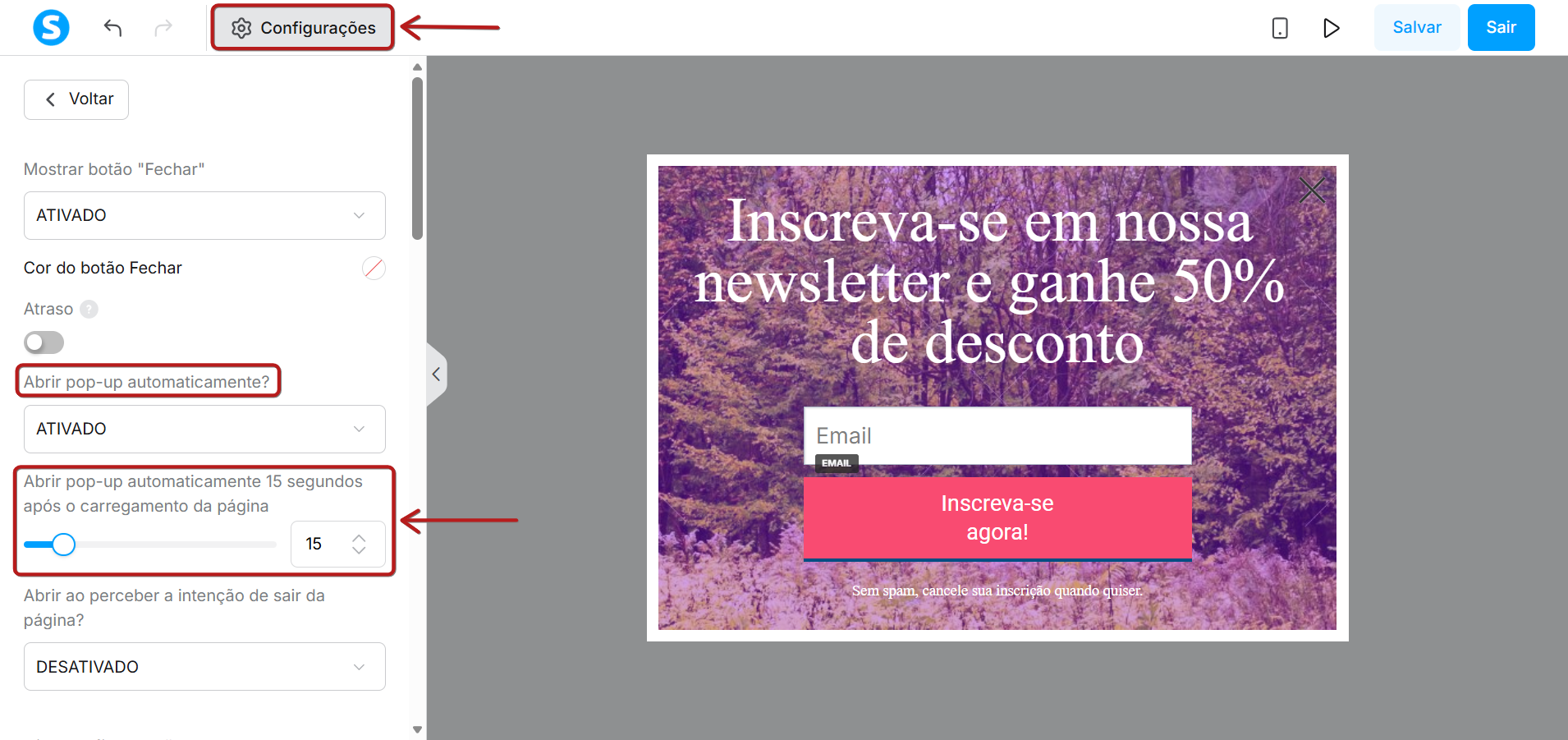 Ainda no editor de páginas, clique em Configurações e marque a opção Abrir pop-up automaticamente?.