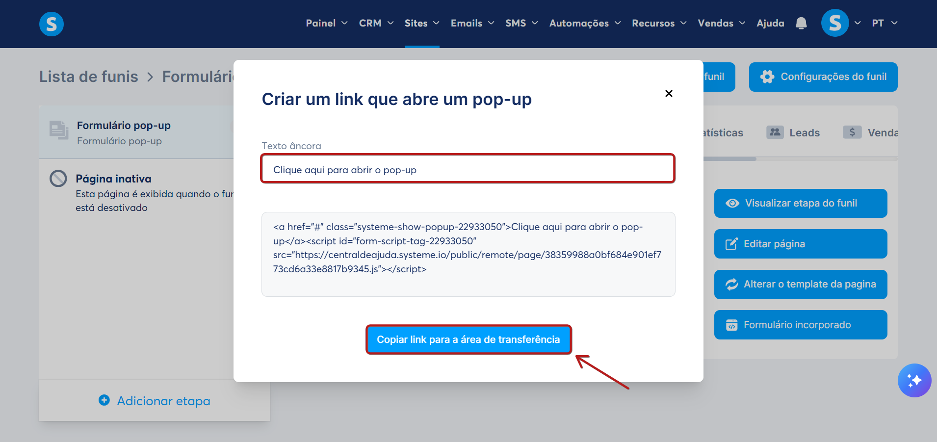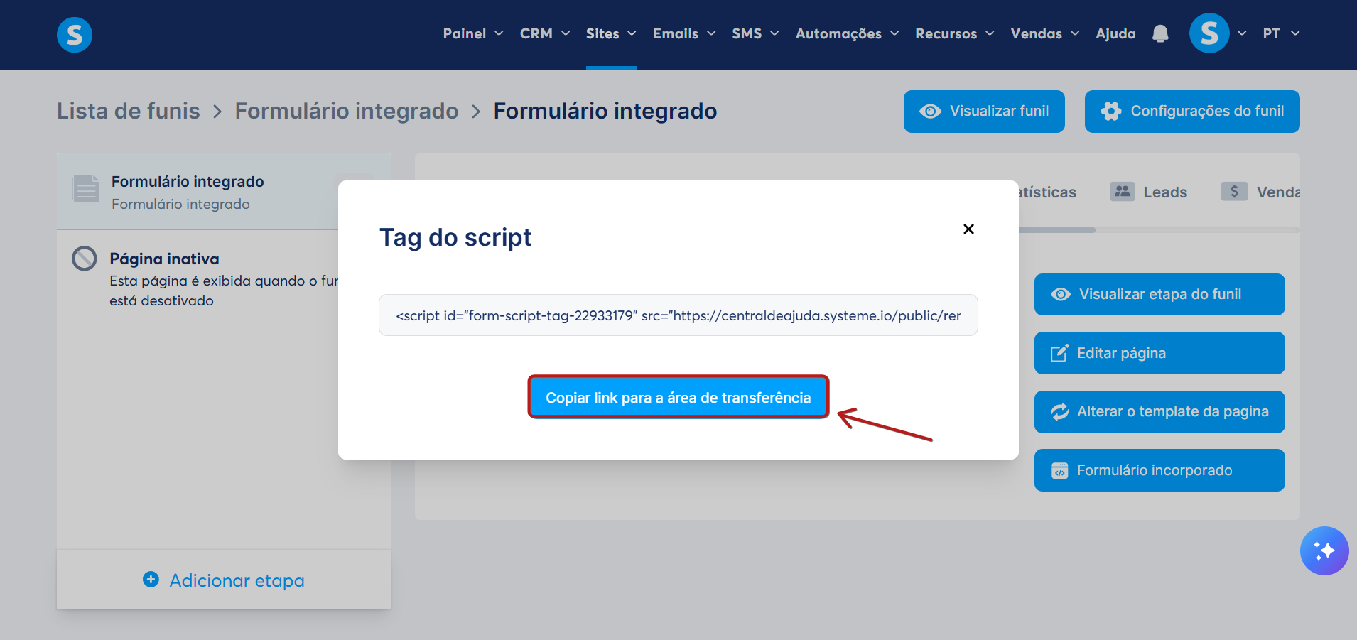 Um pop-up será exibido contendo um link para a página do seu formulário integrado. Clique em Copiar link para a área de transferência.
