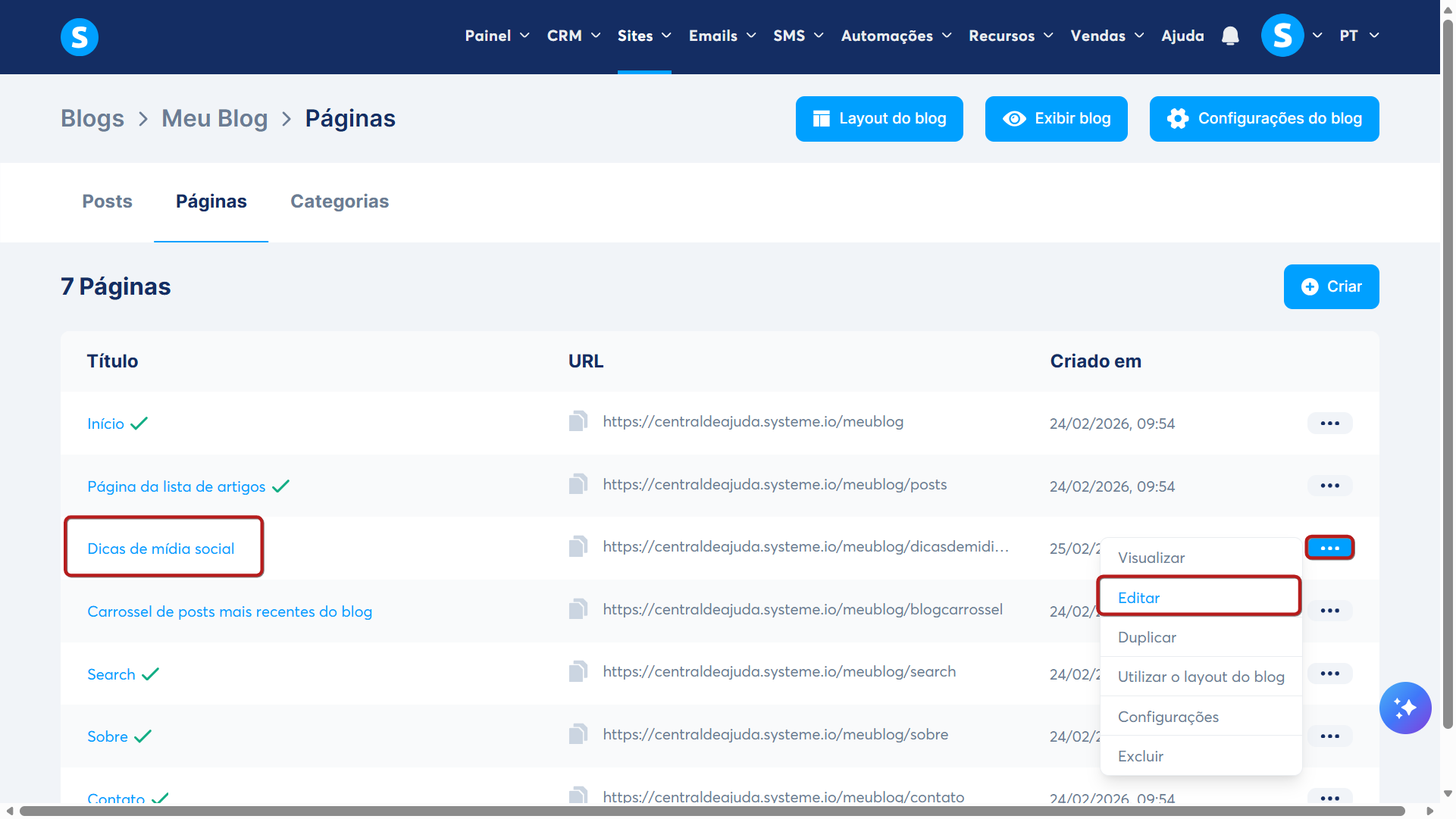 Em seguida, você deverá acessar o editor da página do blog clicando em Editar no menu ou clicando diretamente no nome da página na qual deseja adicionar o formulário integrado.
