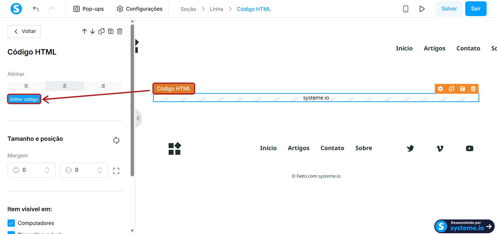 Acesse as configurações do elemento Código HTML.