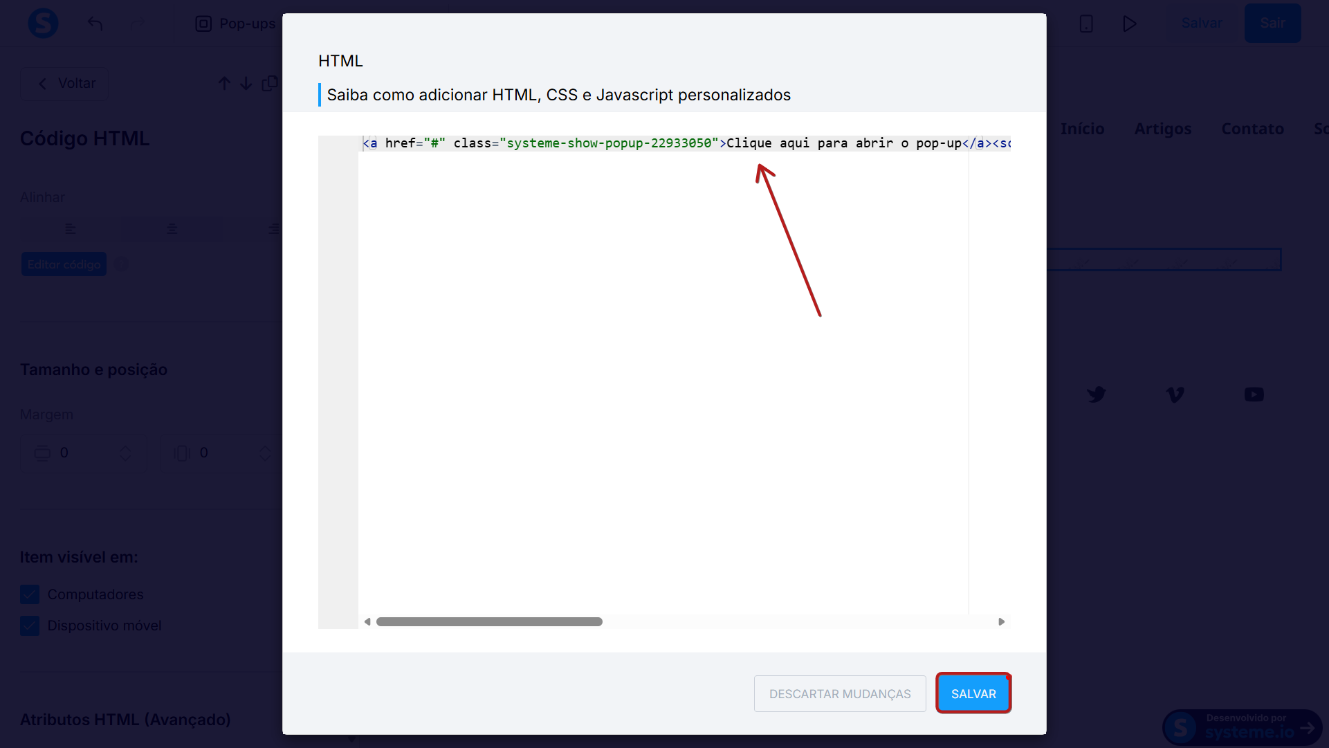 Clique em Editar código, cole o Script do link que abre o formulário pop-up e clique em Salvar.