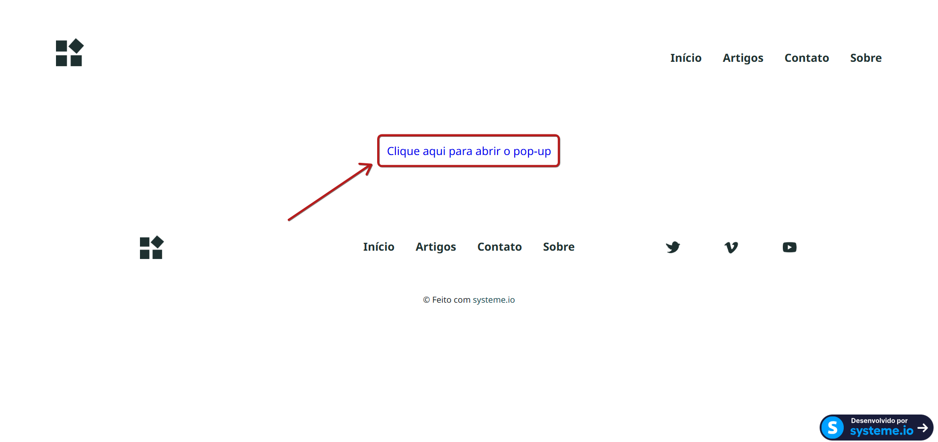 Em seguida, ao visualizar a página do blog, veremos a exibição do formulário pop-up quando clicarmos no texto Clique aqui para abrir o pop-up, conforme mostrado abaixo.