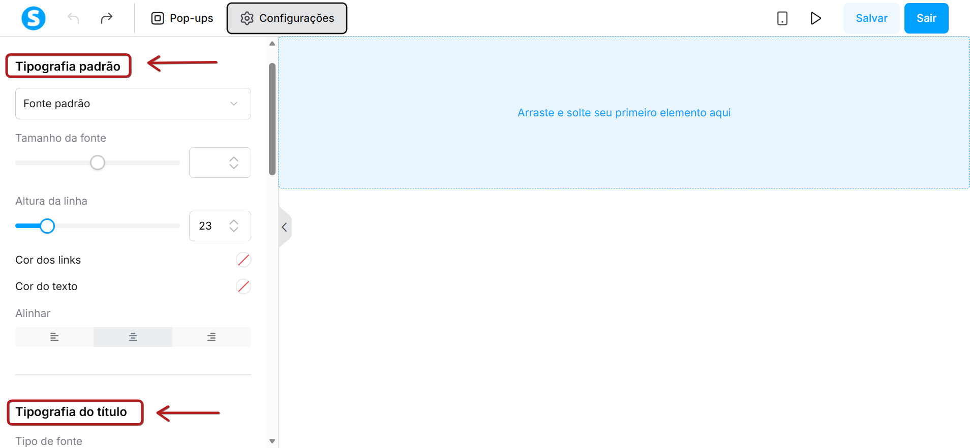 No editor de páginas, você pode modificar a Tipografia padrão e a Tipografia do título, além de arrastar e soltar elementos na página.