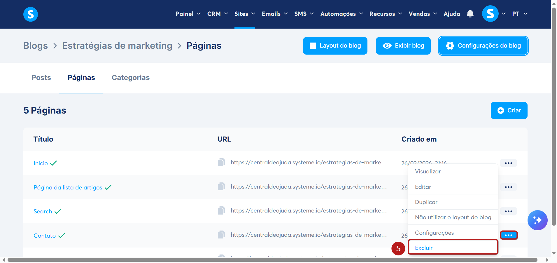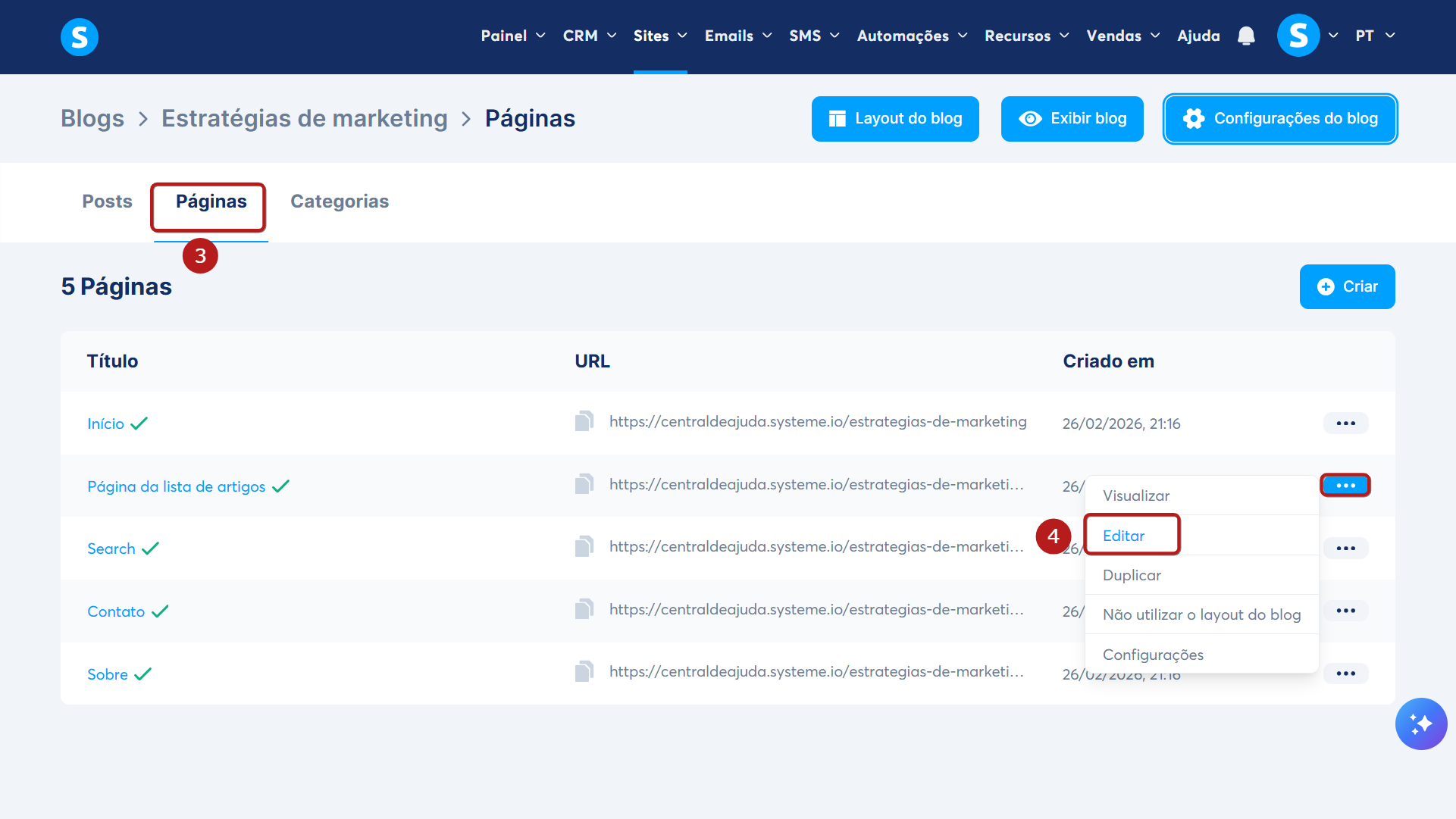 Ao criar um novo blog, o sistema automaticamente gera 5 páginas de exemplo. Para modificá-las, clique no menu de 3 pontos e depois em Editar (4).