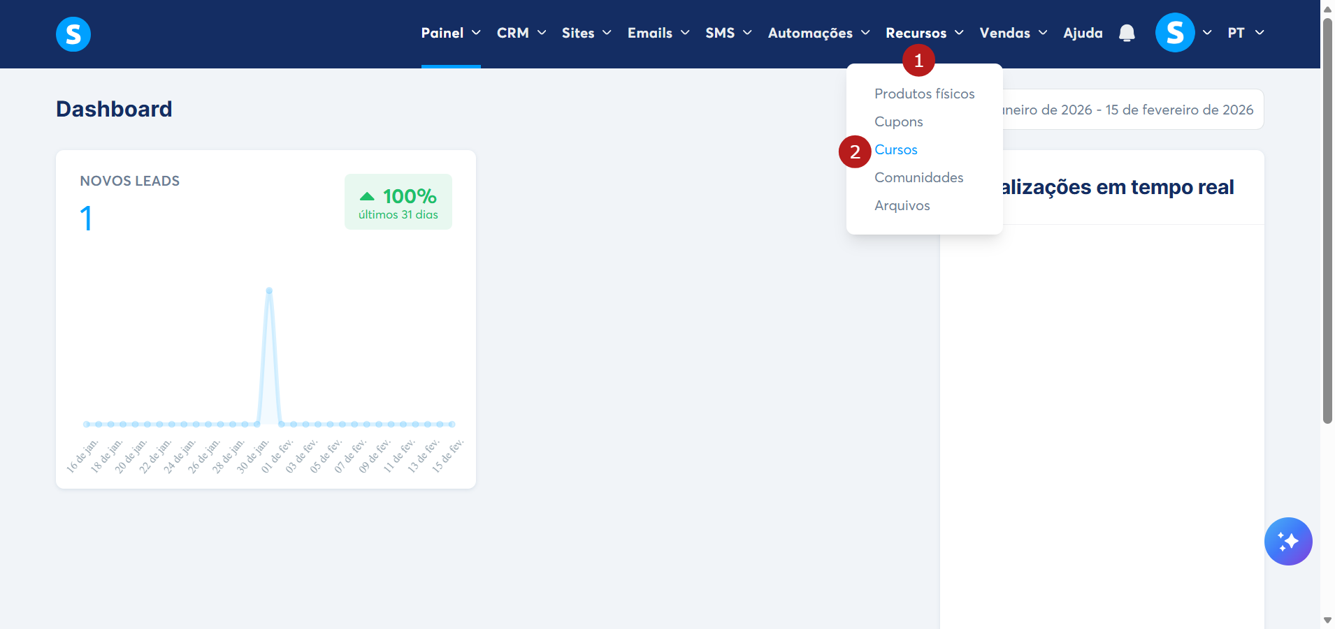 Em seu painel, acesse o menu Recursos (1) e selecione Cursos (2).