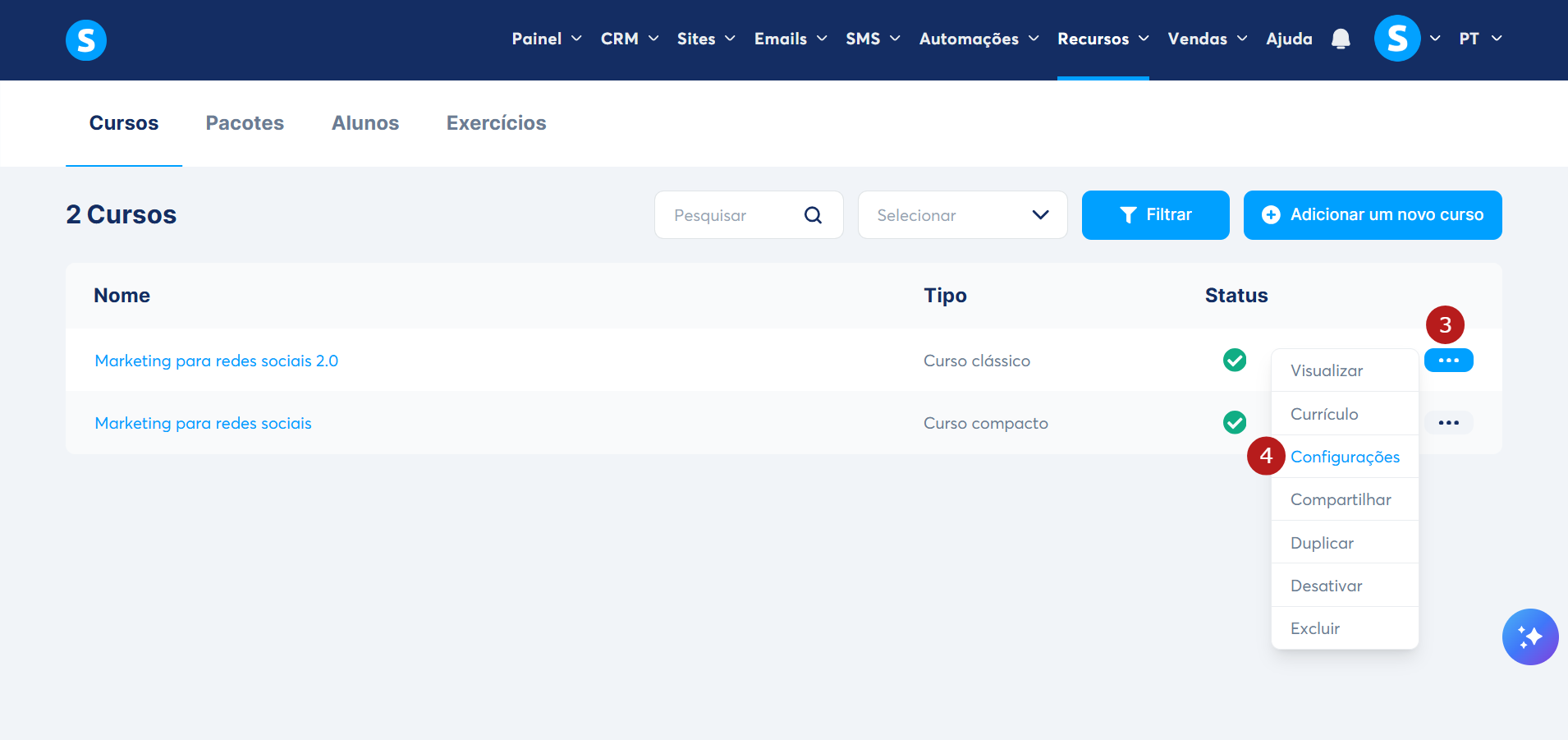 Na lista de cursos, clique no menu de três pontos ao lado do curso desejado (3) e selecione Configurações (4).