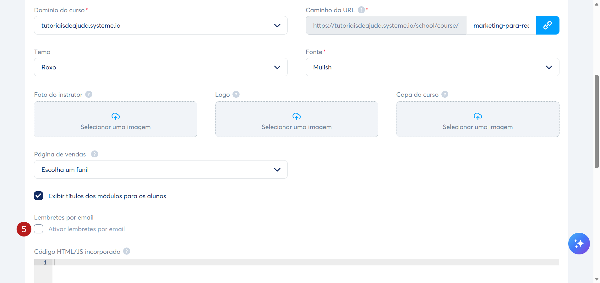 Você será redirecionado para a página de configurações do curso. Desça até a seção Lembretes por email (5).