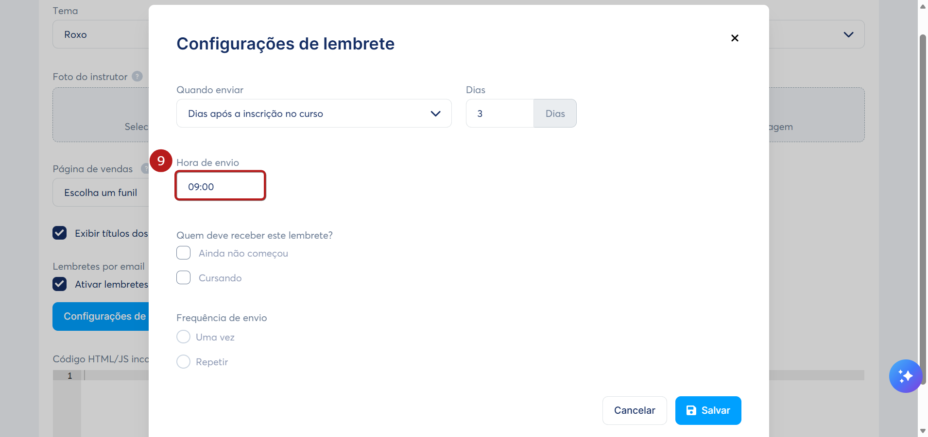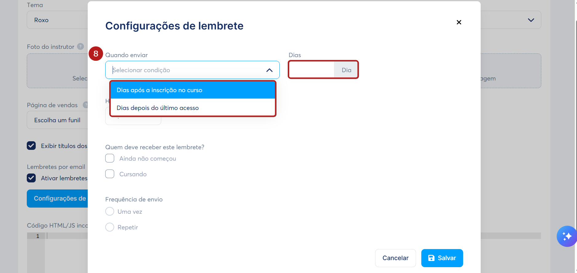 Insira o número de dias desejado para que a condição escolhida dispare o lembrete. Além disso, é possível definir o horário específico do dia para o envio do email (9).
