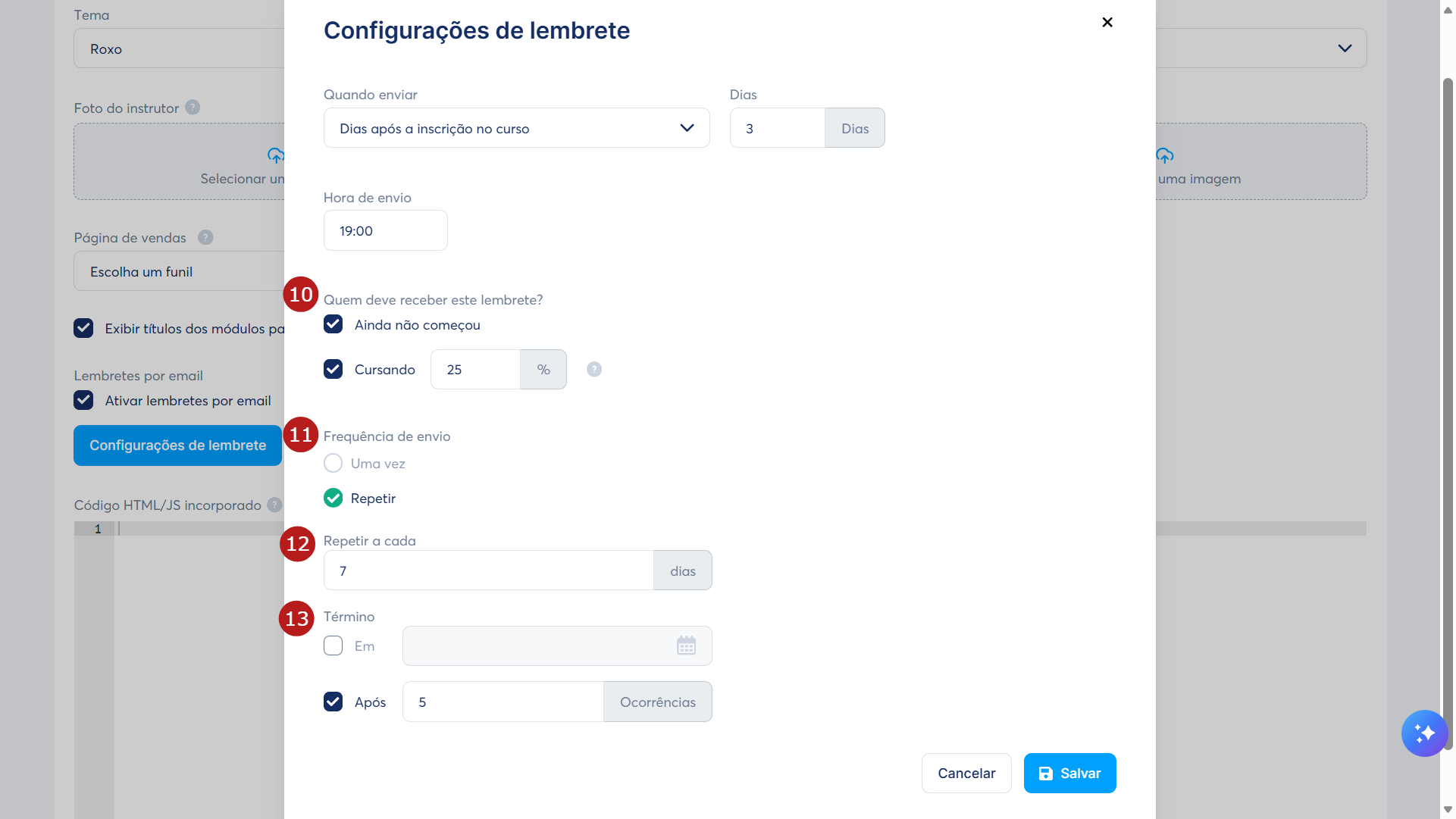 Ao clicar no botão Configurações de lembrete, um pop-up abrirá com as seguintes opções para configuração:
