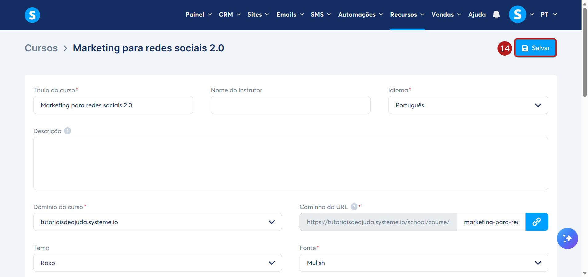 Após finalizar todas as configurações de lembrete e personalizar sua mensagem, clique em Salvar (14) no canto superior direito da tela de configurações do curso para ativar o recurso de lembretes por email.