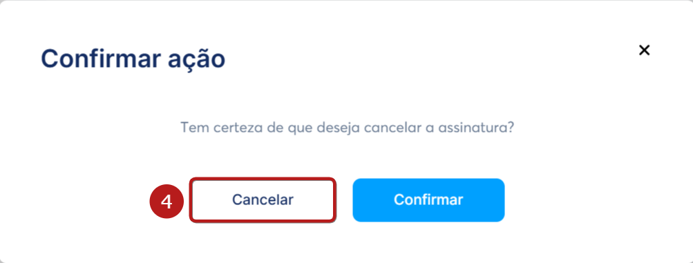 Um pop-up será exibido solicitando a confirmação do cancelamento. Clique em Confirmar para cancelar sua assinatura (4).