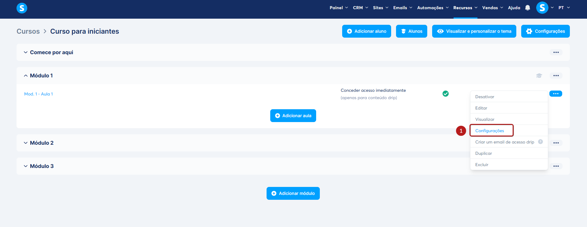 Para adicionar uma seção de comentários a uma aula, acesse o curso para visualizar a lista de módulos e aulas. Na aula onde deseja adicionar a seção de comentários, clique em Configurações (1).