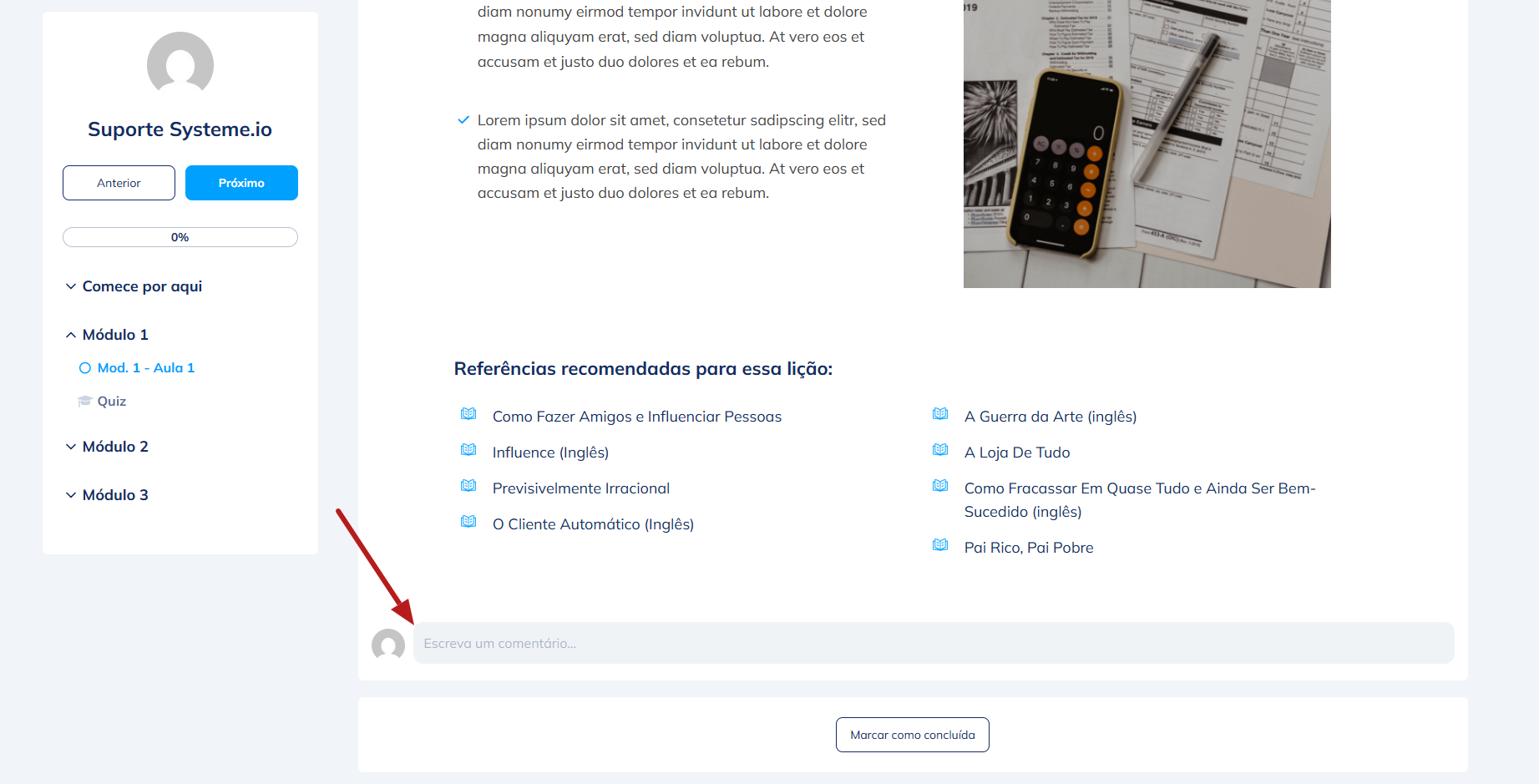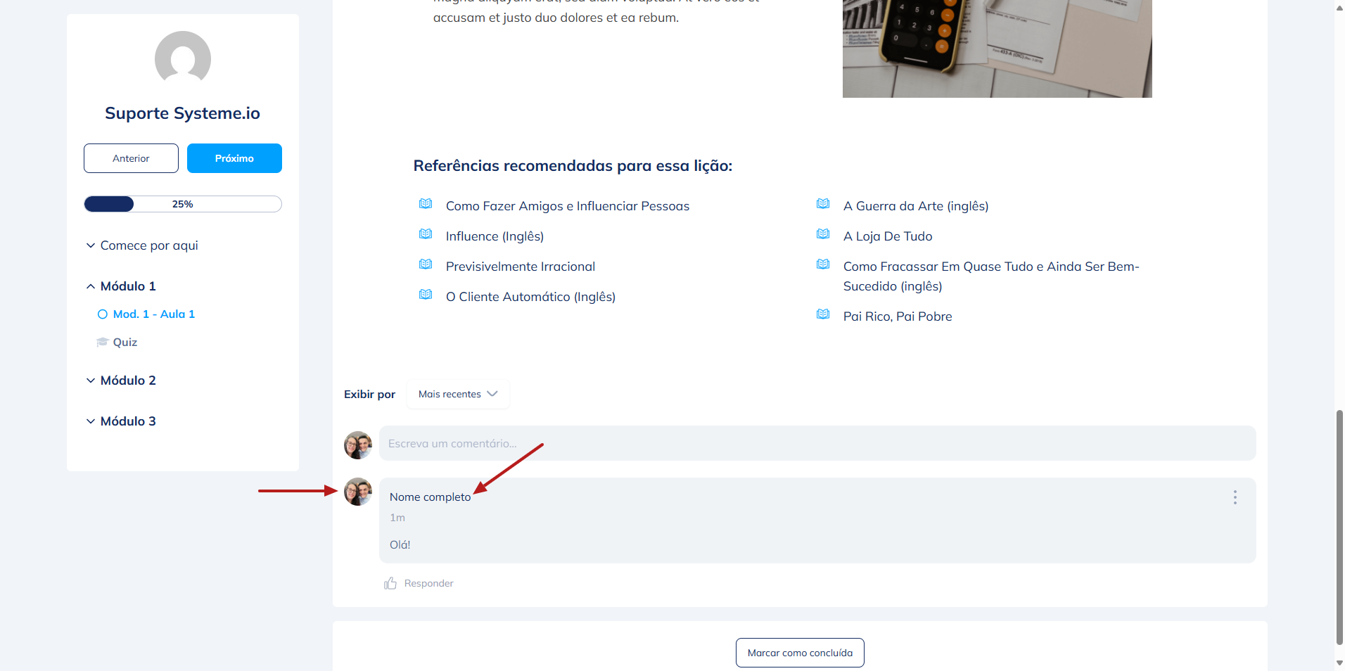 Junto com o comentário, serão exibidos o nome completo e a foto de perfil do aluno.