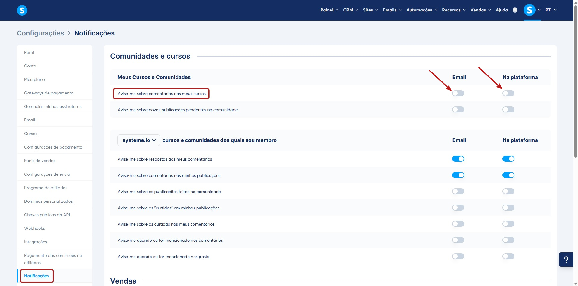 Vale destacar que, se você deseja ser notificado a cada novo comentário deixado por um aluno, basta ativar as caixas Email ou Na plataforma na opção Avise-me sobre comentários nos meus cursos, localizado na seção Notificações da sua conta da systeme.io.