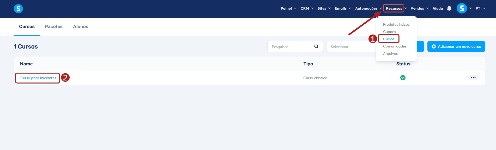 No menu, vá até a aba Recursos, clique em Cursos (1) e depois clique no seu curso (2).