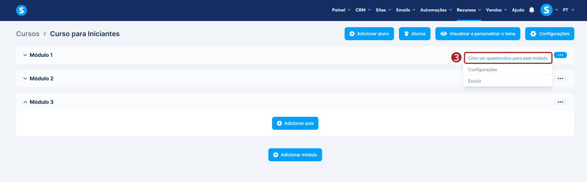 Vá até o módulo desejado, clique no menu de 3 pontos (…) e depois em Criar um questionário para este módulo (3).