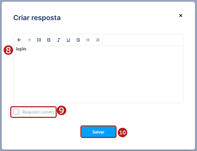 Digite sua resposta (8), deixe a caixa Resposta correta desmarcada se for uma resposta incorreta (9) e, por fim, clique em Salvar (10).
