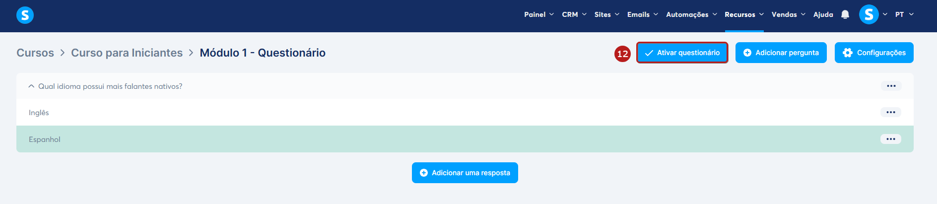 Para tornar o questionário visível para seus alunos, clique no botão Ativar questionário (12).