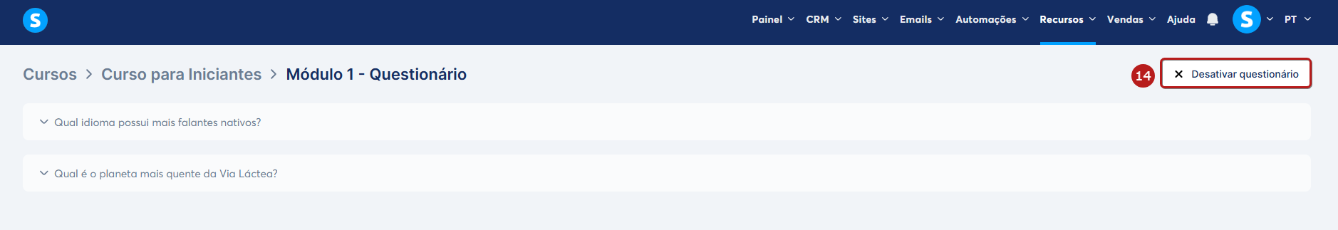 Se você precisar desativar o questionário, clique no botão Desativar questionário (14).