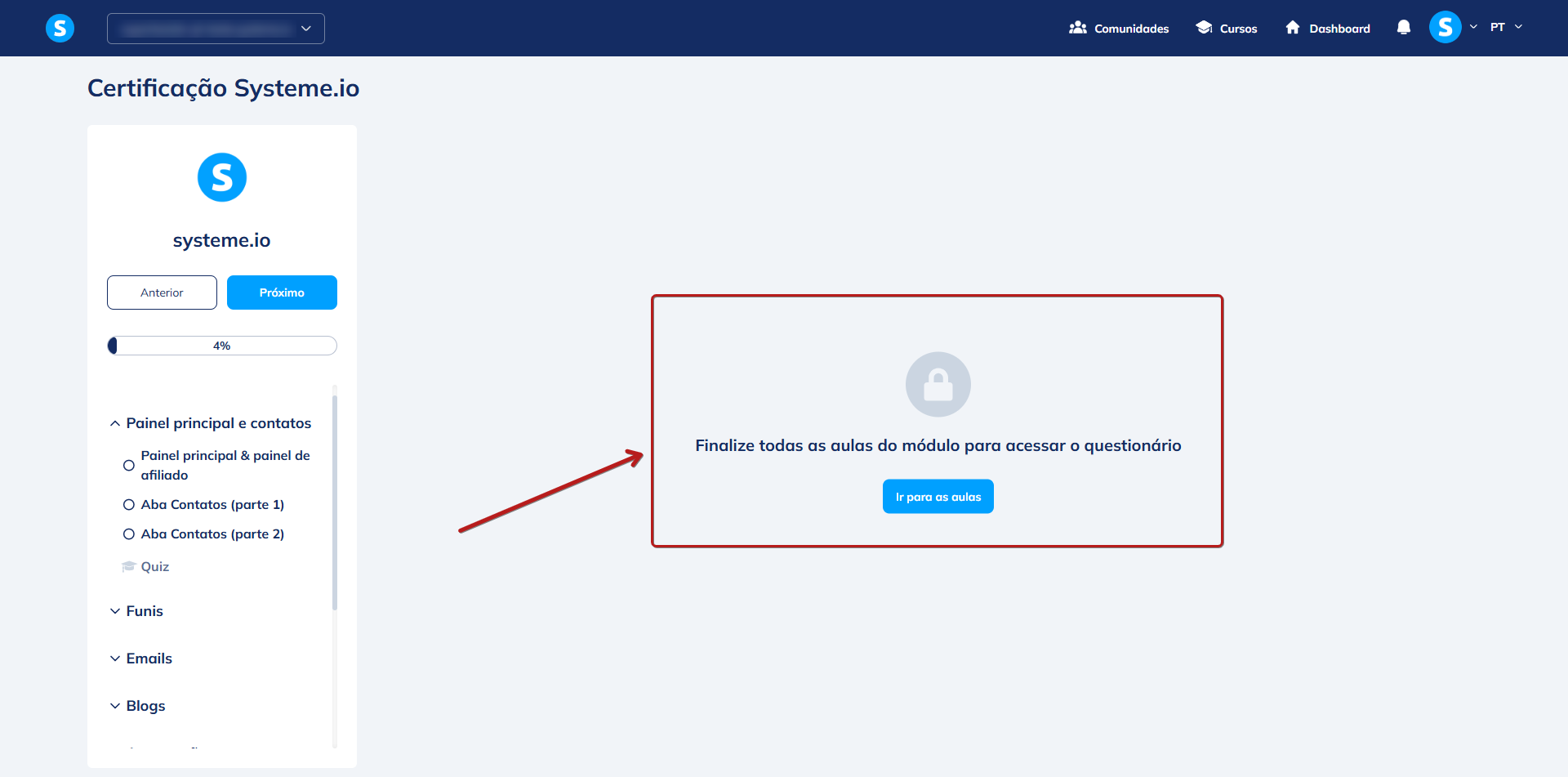 Importante: se um aluno tentar abrir uma aula no próximo módulo antes de concluir o atual, ele receberá a seguinte mensagem: