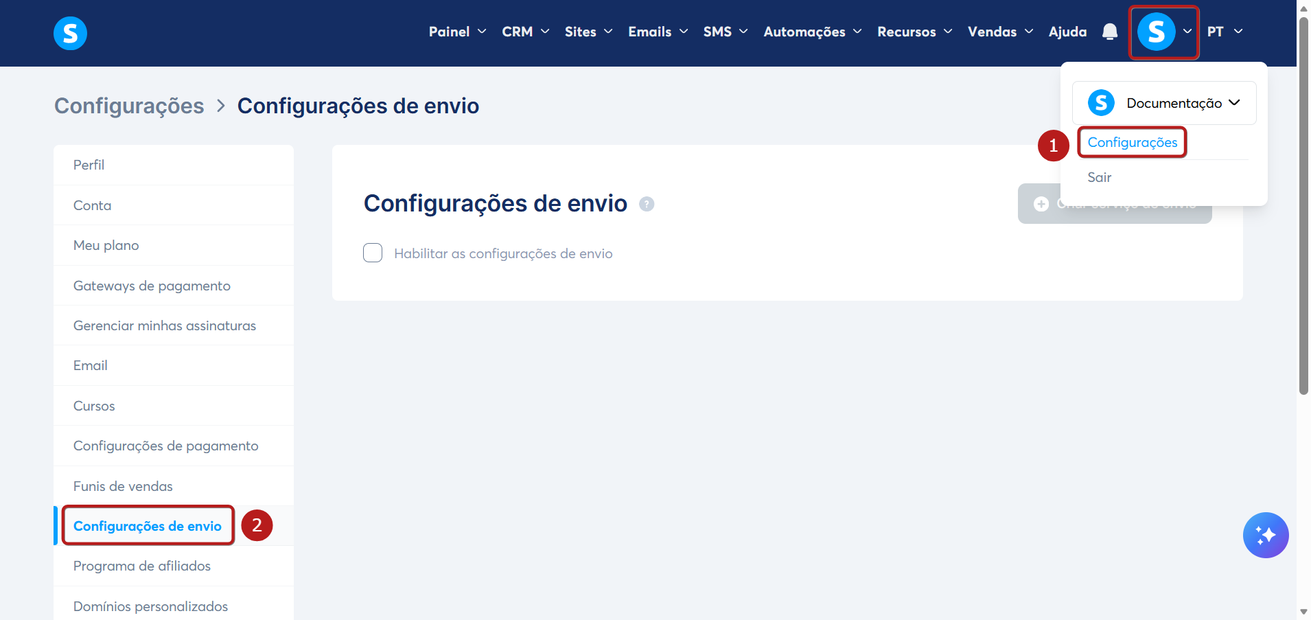 Para habilitar as taxas de envio, acesse o menu em sua foto de perfil, selecione Configurações (1) e clique em Configurações de envio (2).