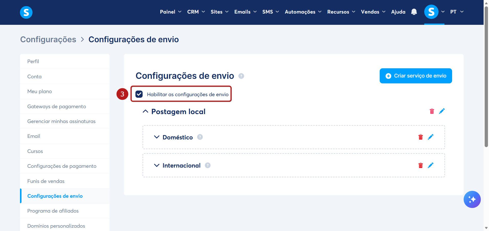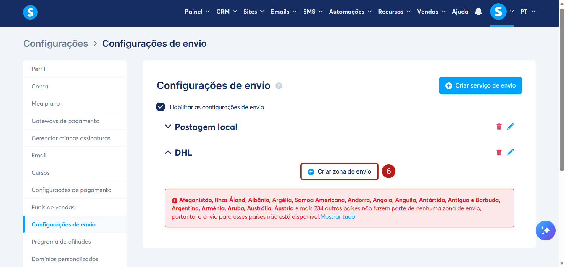 Você pode criar serviços de entrega como correio local, DHL, UPS, etc. Basta clicar em Criar serviço de envio (4).