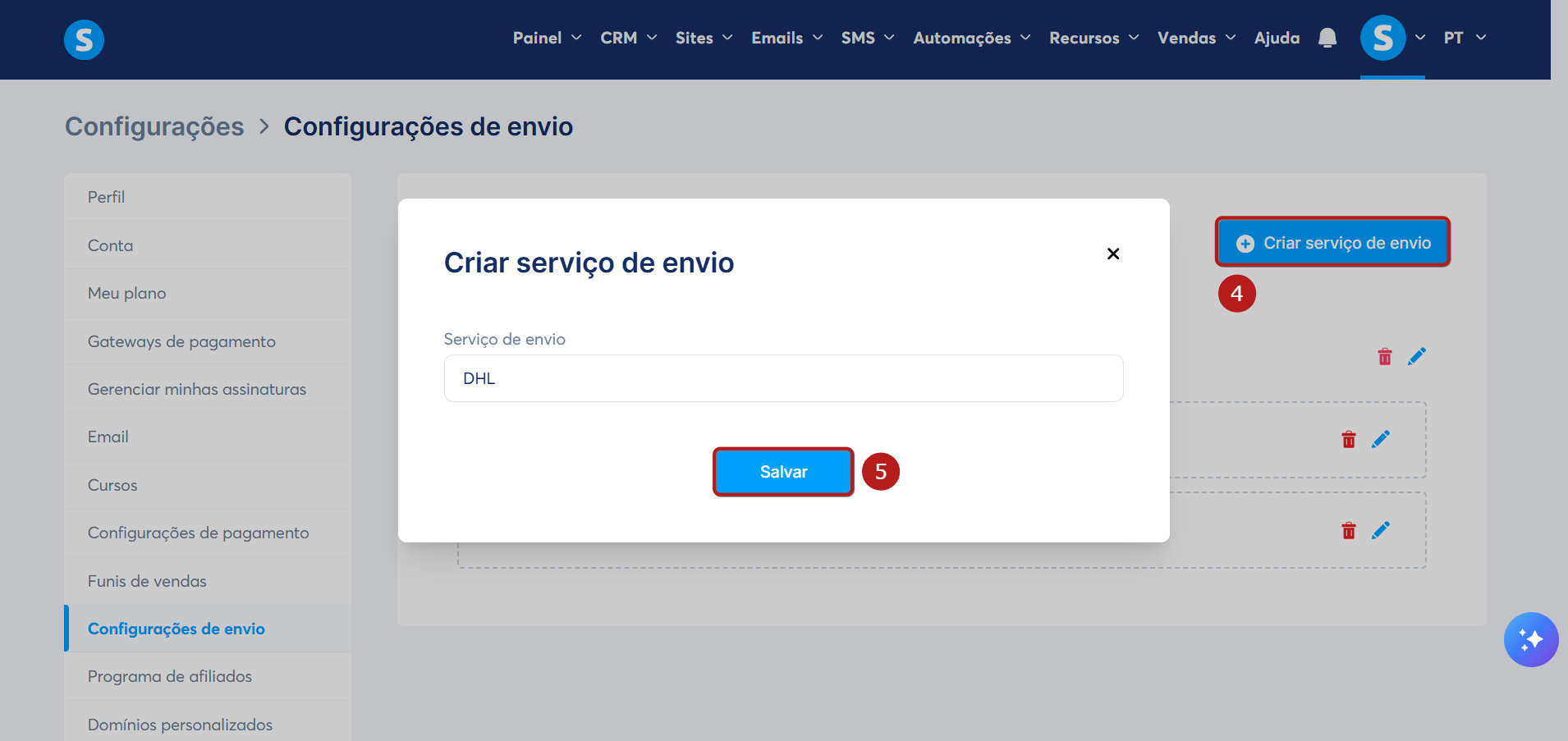 Um pop-up será exibido, onde você deve adicionar o nome do serviço de envio e clicar em Salvar para confirmar (5).