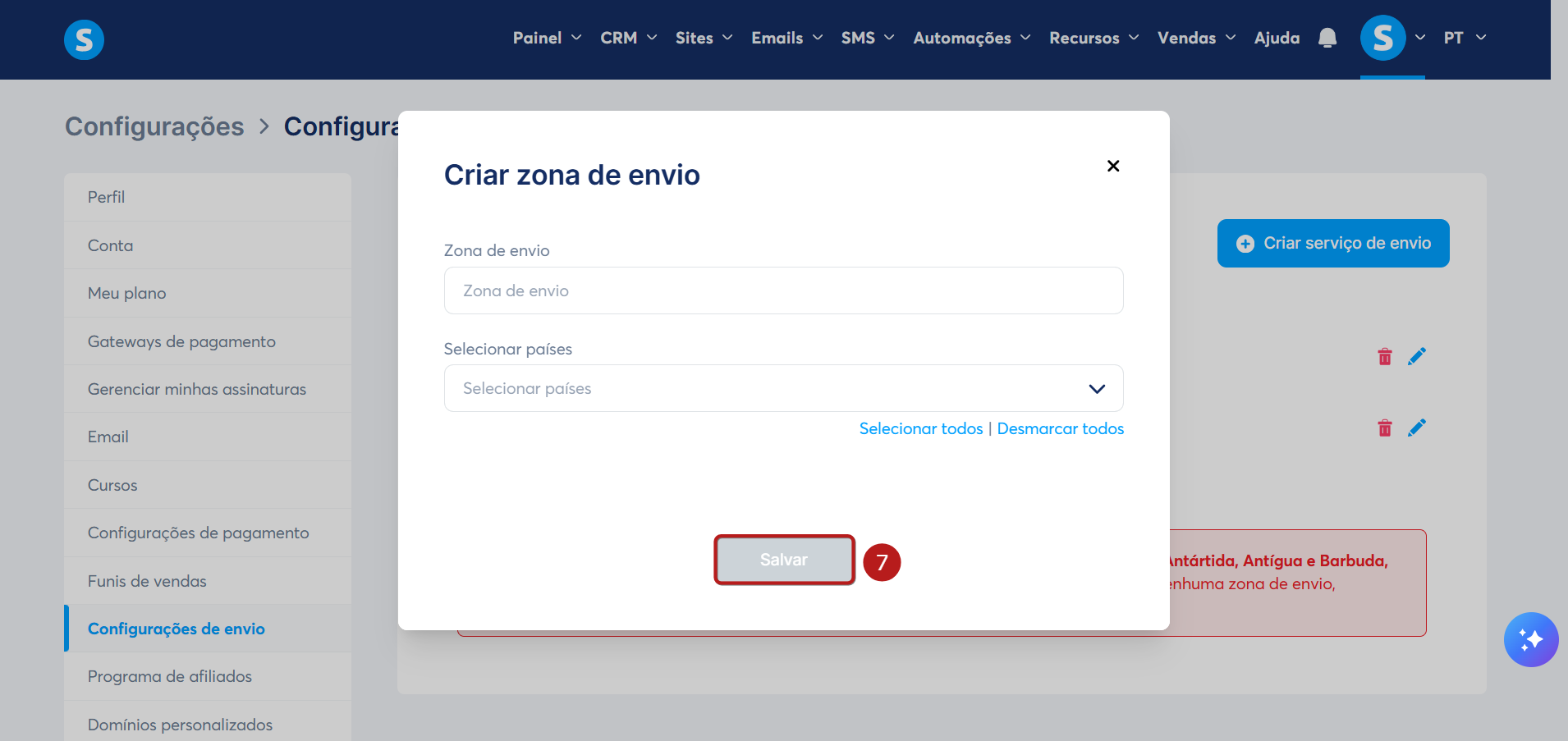 No pop-up que será exibido para criar uma nova zona, selecione a zona de envio e os países. Em seguida, clique em Salvar para confirmar a nova zona (7).