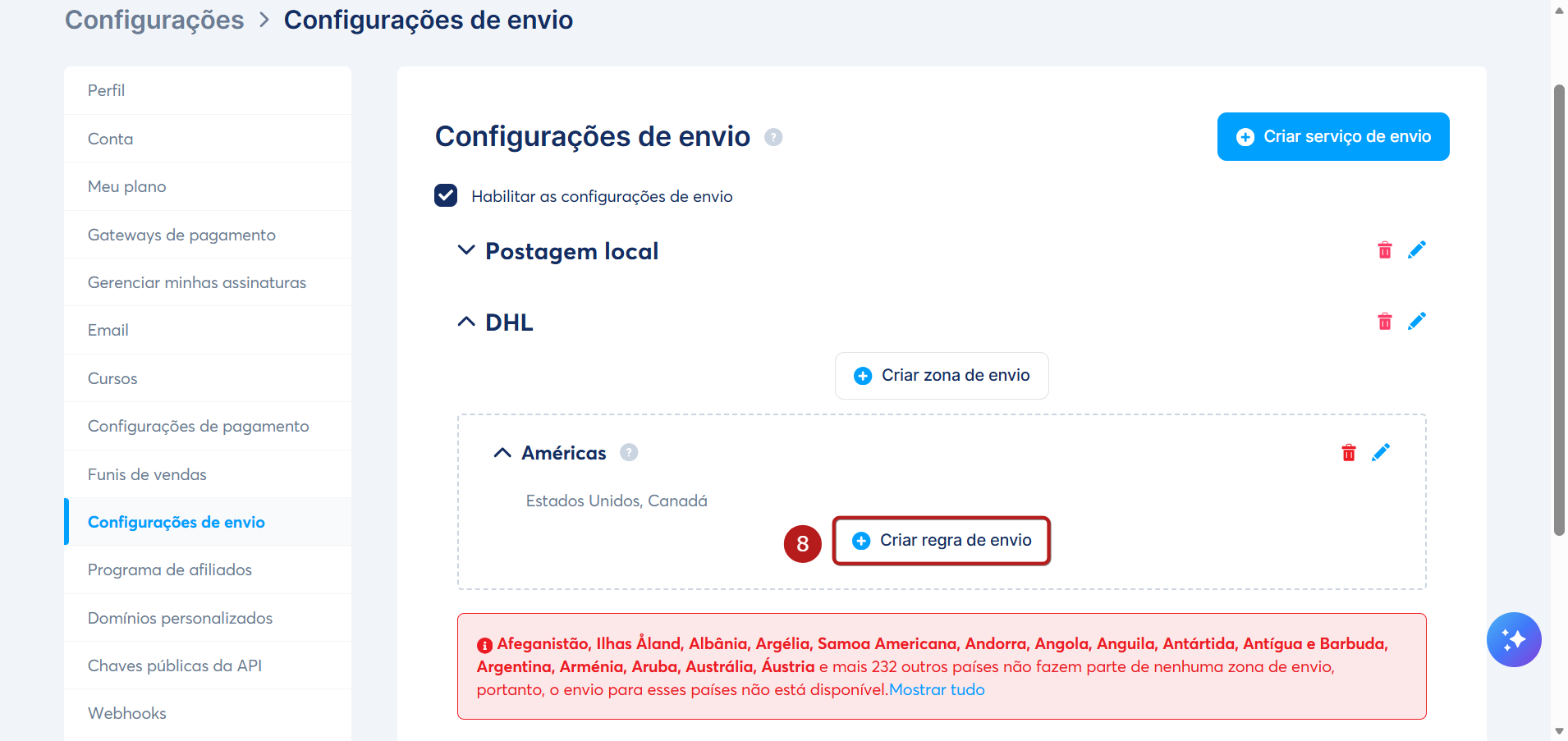 Por fim, defina as regras de envio para seus produtos físicos clicando em Criar regra de envio (8).