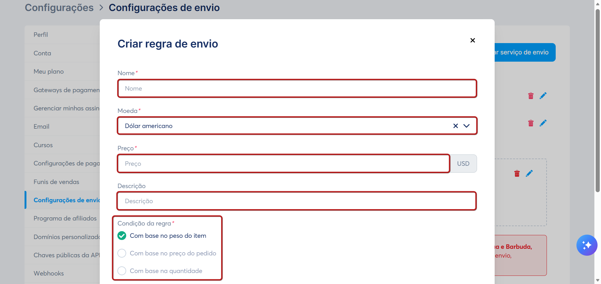 Ao criar uma regra de envio, você tem a opção de criar regras com base no peso, no preço do pedido ou na quantidade: