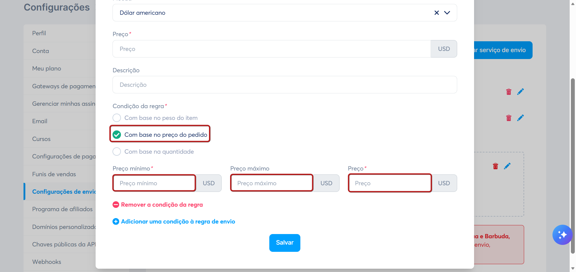 Você deve definir um preço mínimo e máximo para o pedido e o custo de envio para sua regra.