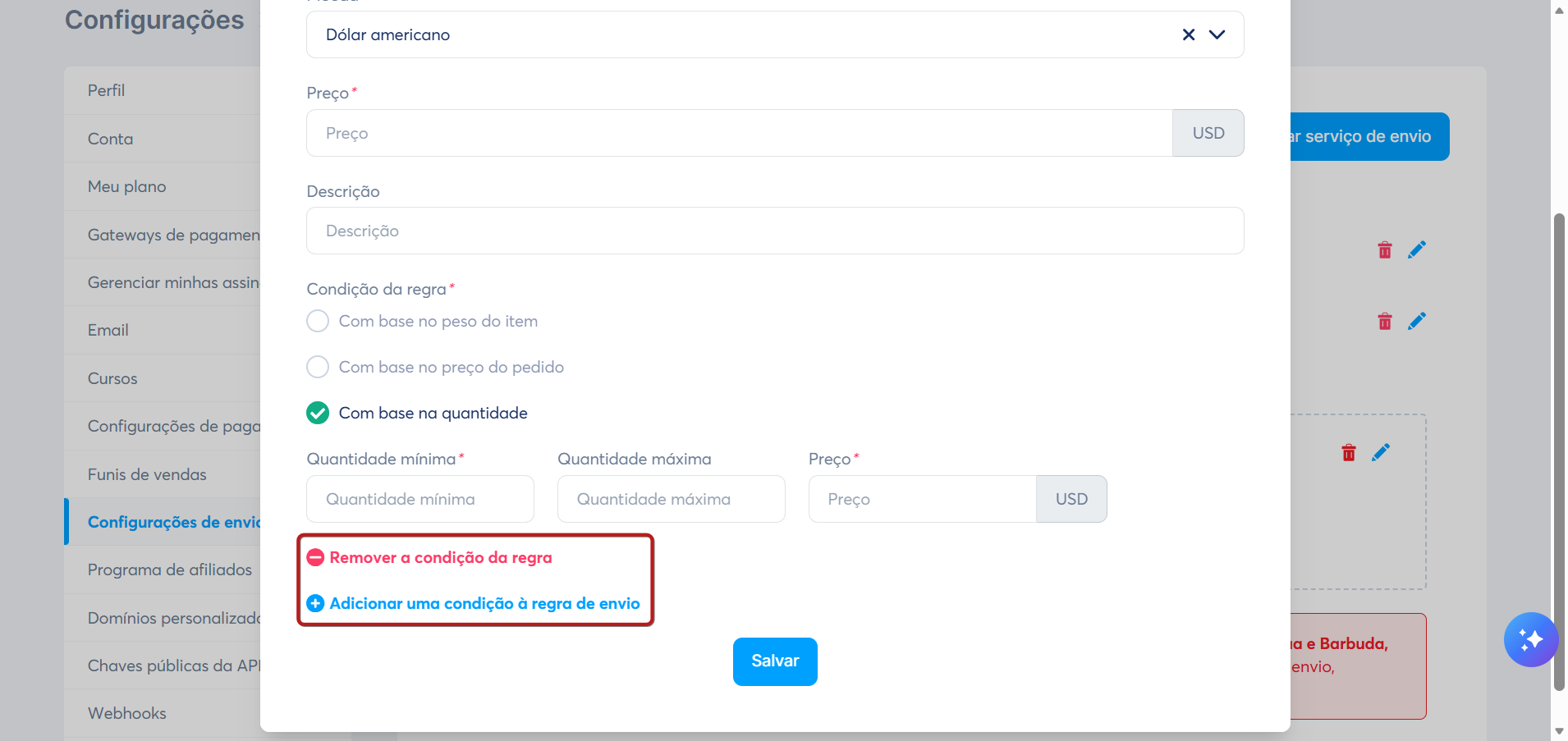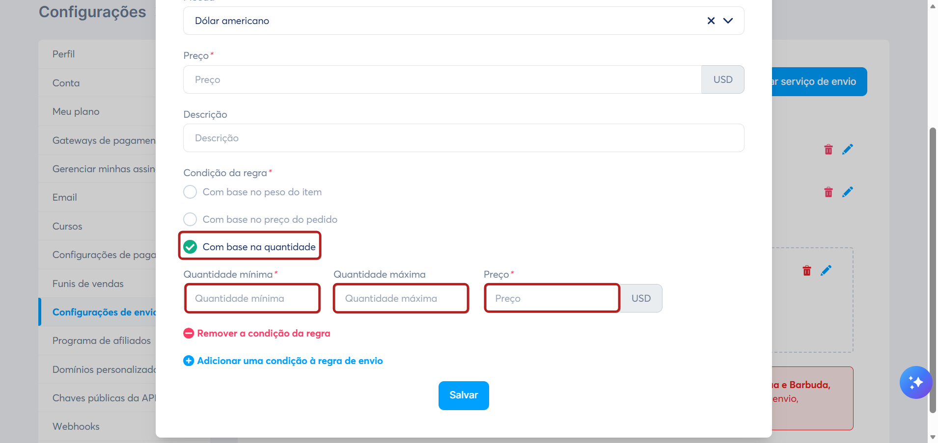 Você deve selecionar a quantidade mínima, máxima e o custo de envio para sua regra.