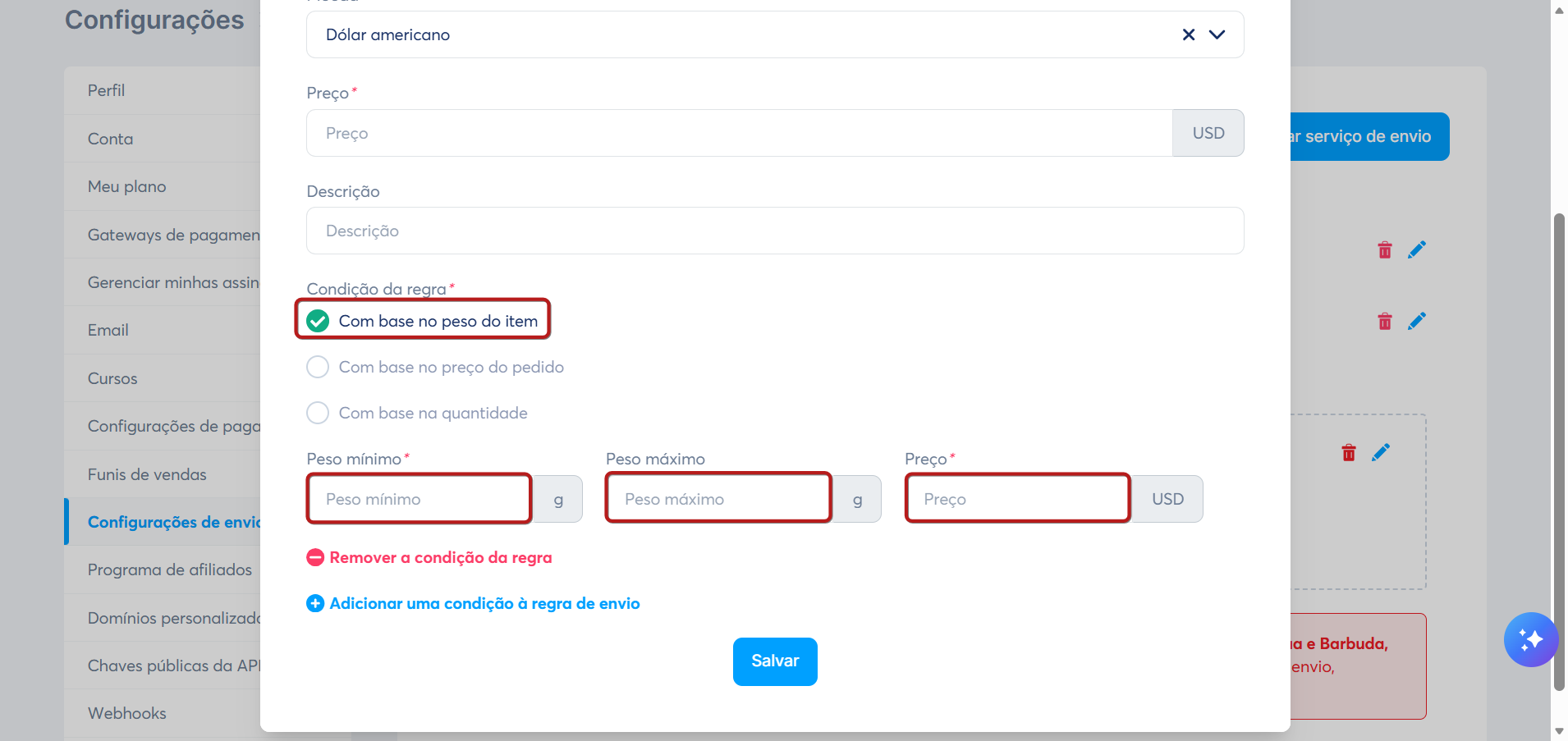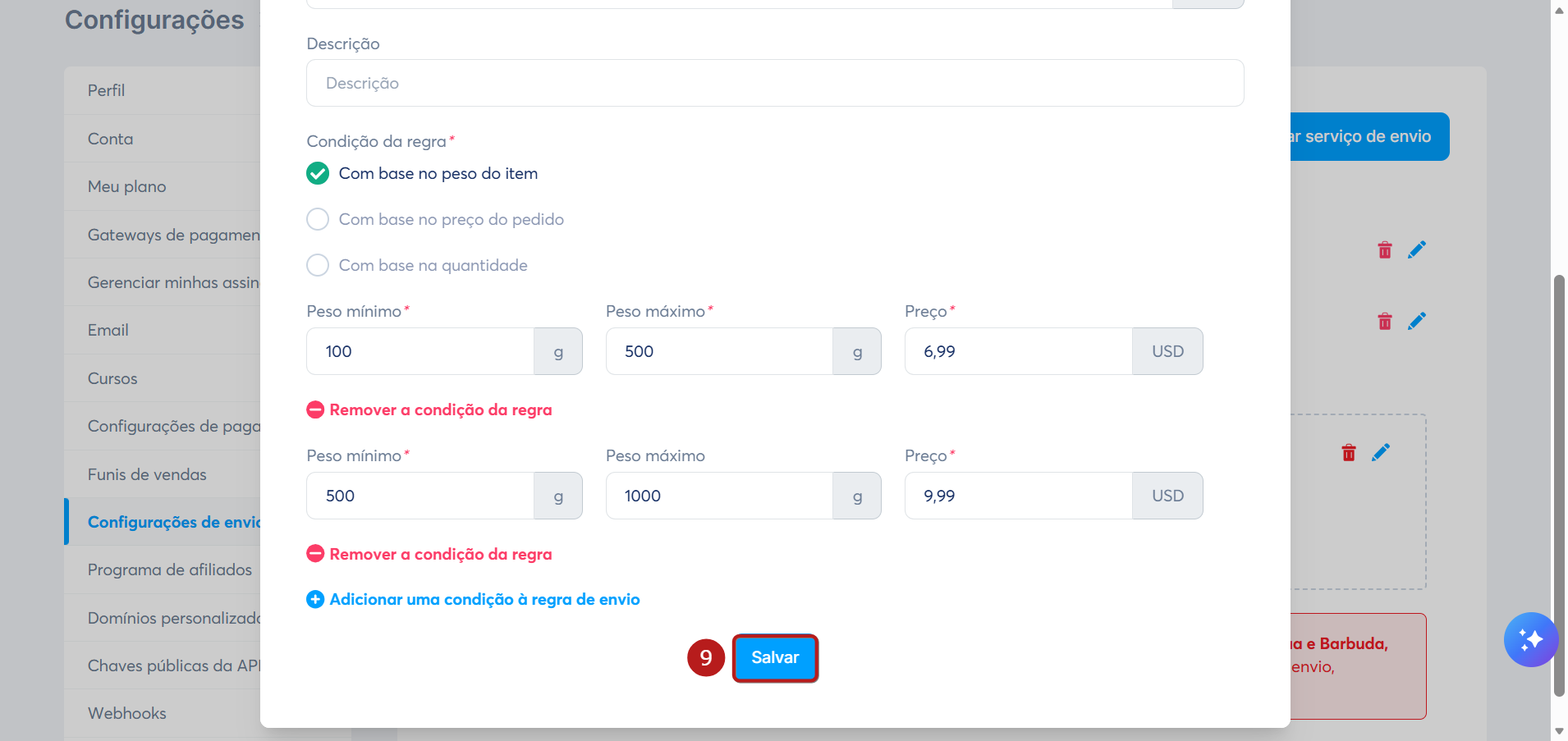 Você precisa definir um peso mínimo, um peso máximo e o custo de envio para esta regra.