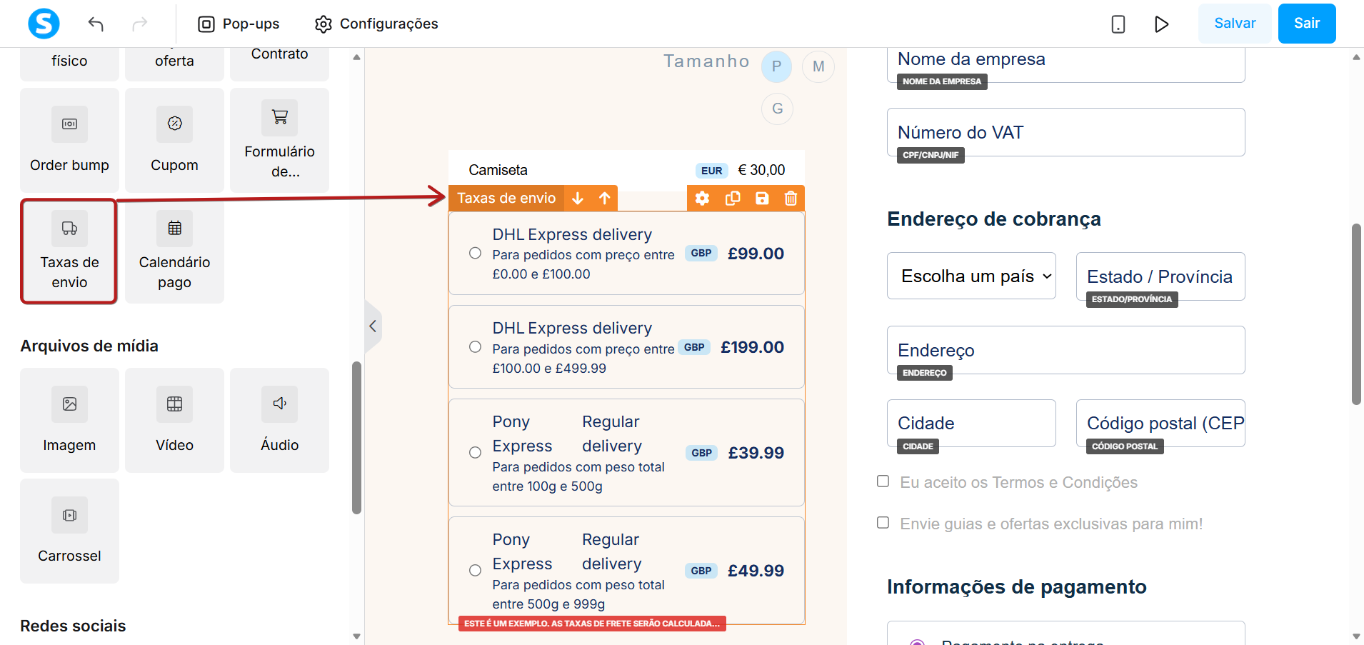 Ao adicionar produtos físicos a uma página de pagamento, você deve incluir o elemento Taxas de envio, arrastando-o diretamente para o local desejado em sua página de pagamento.