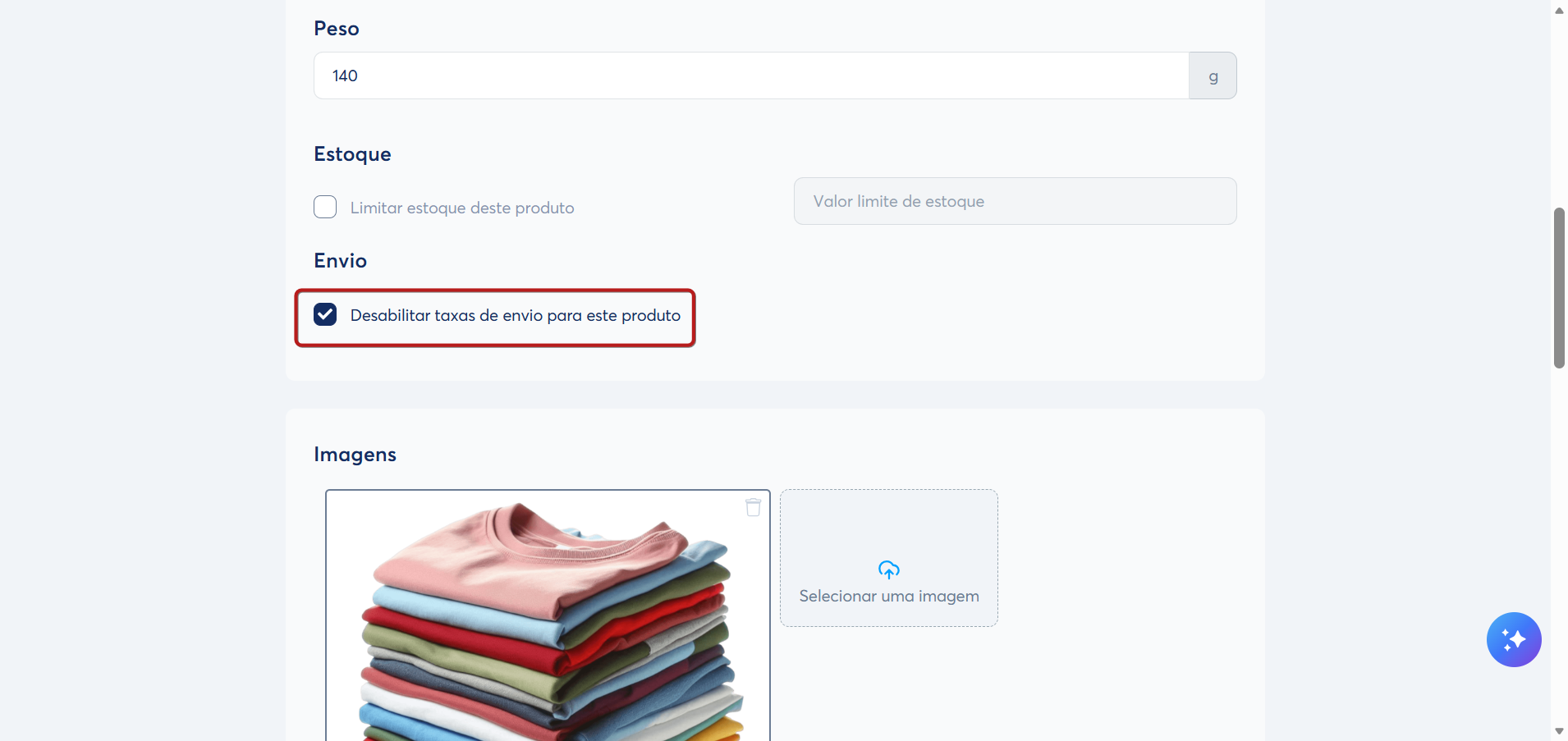 Importante: para desativar as taxas de envio para determinado produto físico, basta marcar a opção Desabilitar taxas de envio para este produto nas configurações do produto.