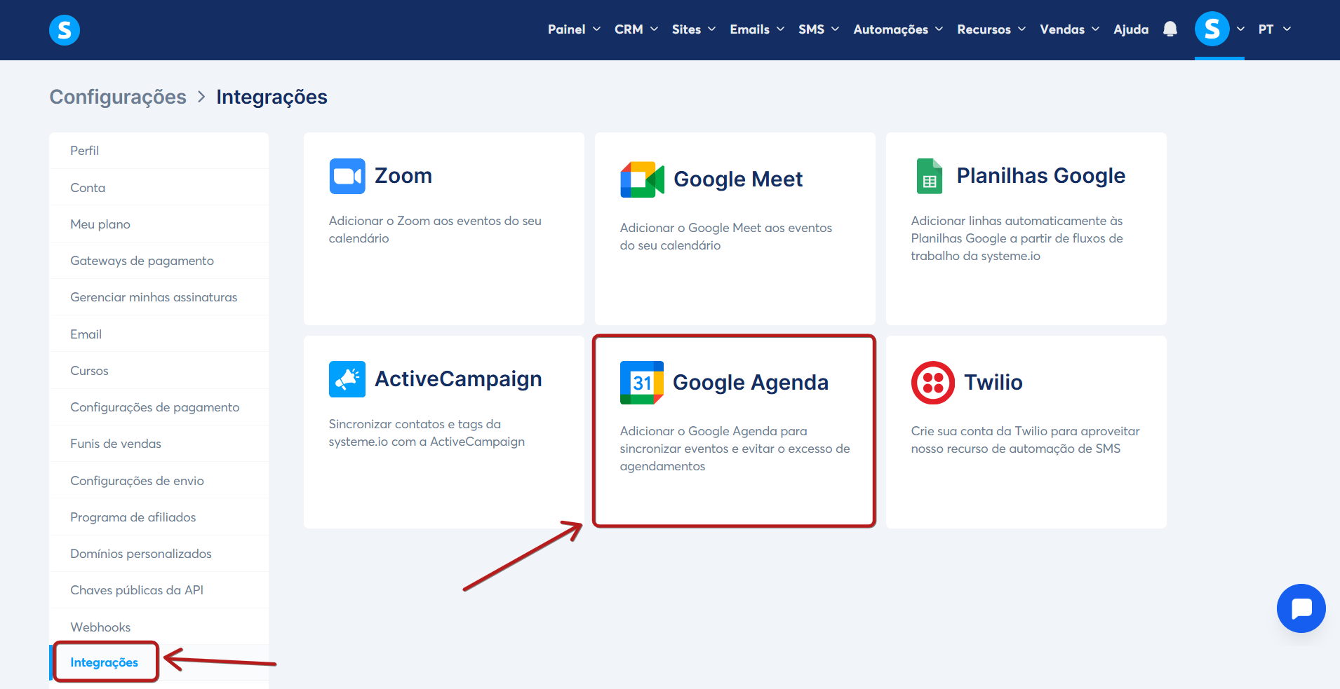 - Clique em Google Agenda entre as várias opções de integração disponíveis para adicionar uma conta Google à sua conta da systeme.io.