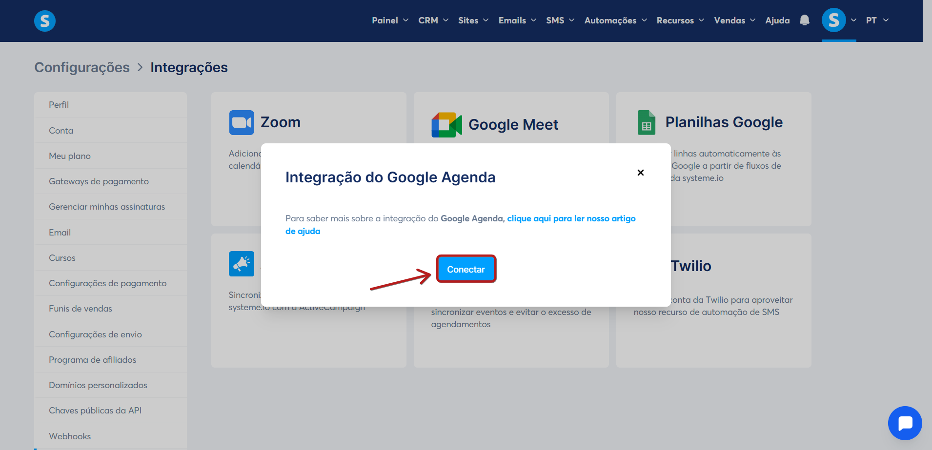 Observação: O Google Meet será conectado por padrão à sua conta systeme.io após a integração com o Google Agenda.