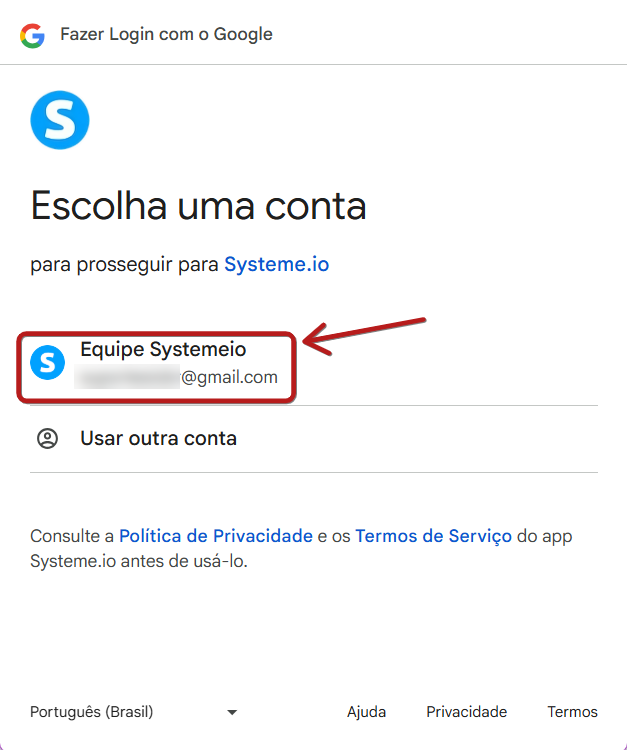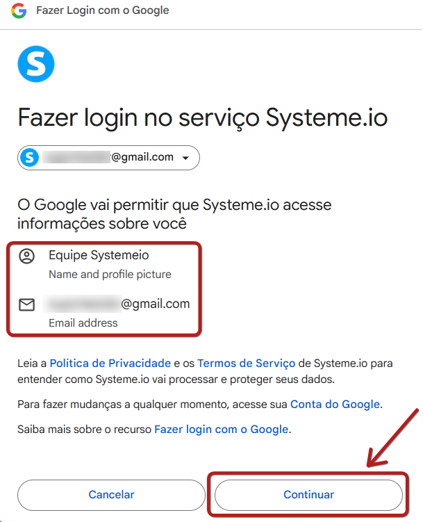- Clique em Continuar para que o Google permita que a systeme.io acesse suas informações.