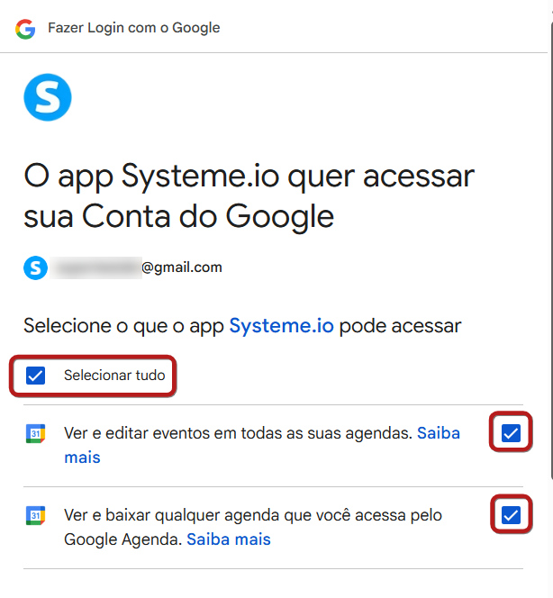- Uma janela será aberta com uma solicitação de permissão da systeme.io para acessar seu Google Agenda. Basta marcar a caixa Selecionar tudo durante a solicitação de permissão, o que ativará o acesso para visualizar, modificar e consultar todos os seus calendários. Isso permite que a systeme.io sincronize automaticamente seus eventos, especialmente para agendamento de compromissos ou automações relacionadas ao calendário.