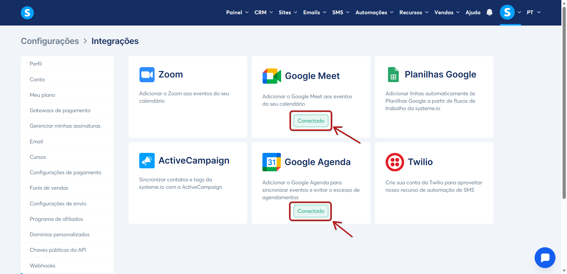 - Por fim, você verá que o Google Agenda agora está integrado em sua conta da systeme.io.