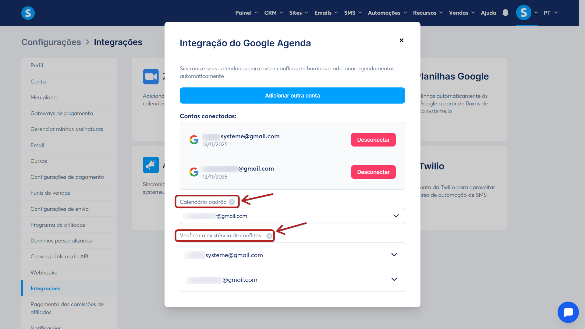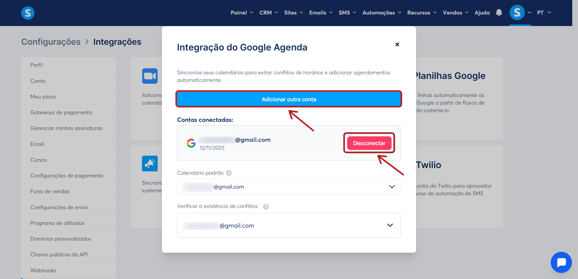 - Você pode integrar várias contas do Google Agenda à sua conta da systeme.io.