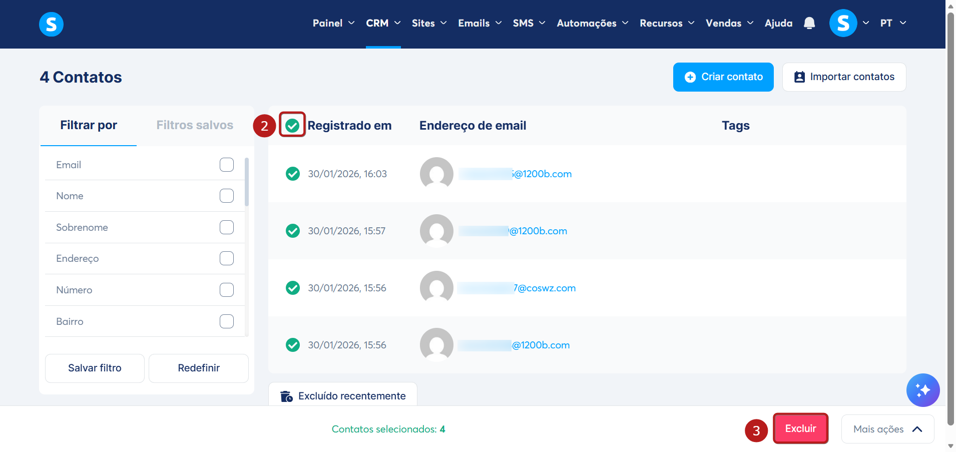 Em seguida, clique no botão Selecionar todos (2) para selecionar toda a sua lista de contatos e depois em Excluir (3).